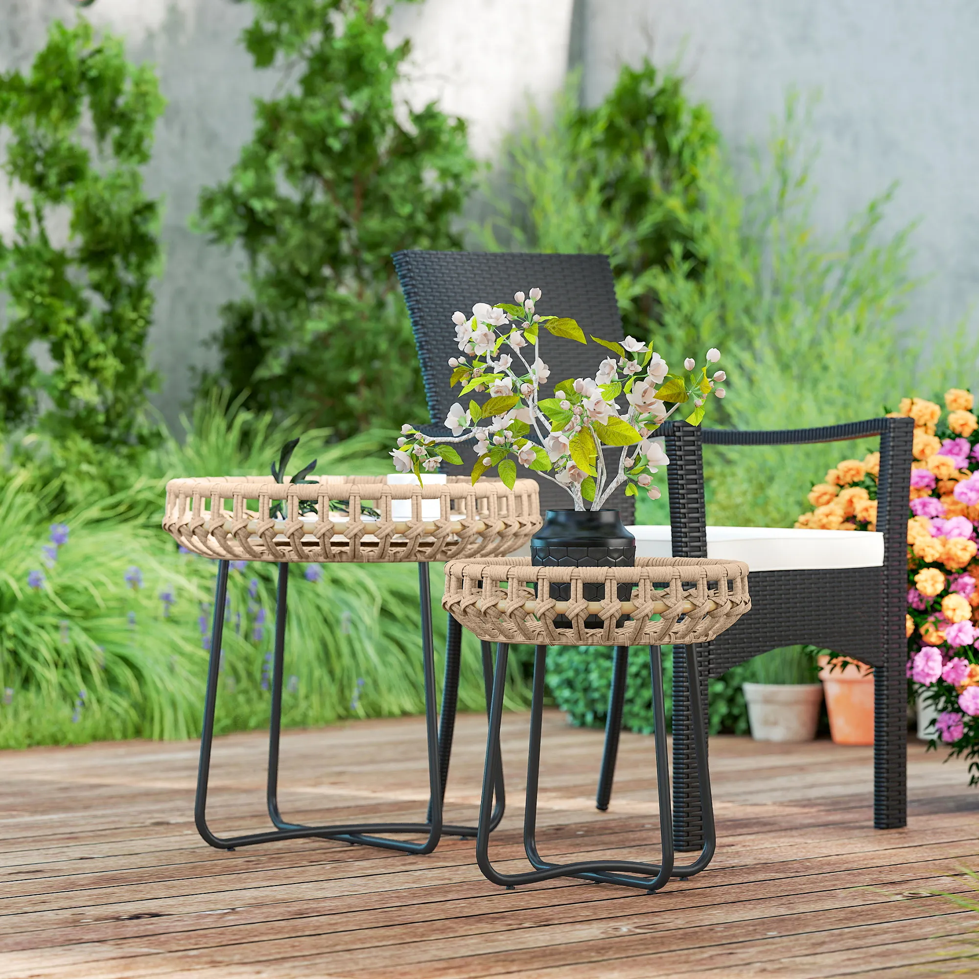 Erlebe die Eleganz der kleinen Rattan-Tische, die sowohl praktisch als auch stilvoll gestaltet sind. Ob für einen modernen Layer-Look oder einzeln aufgestellt - diese runden Rattan-Tische passen sich perfekt deinen Bedürfnissen an. Die edle schwarze Stahlbasis und der wetterfeste Rattanbelag ergeben ein stilvolles Ensemble, das drinnen wie draußen überzeugt.