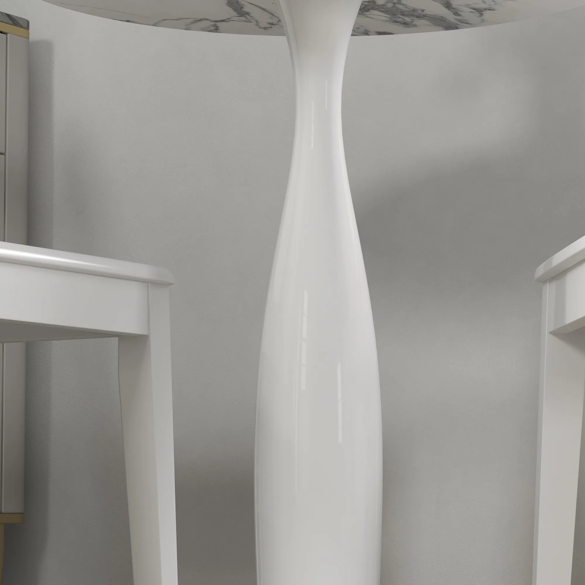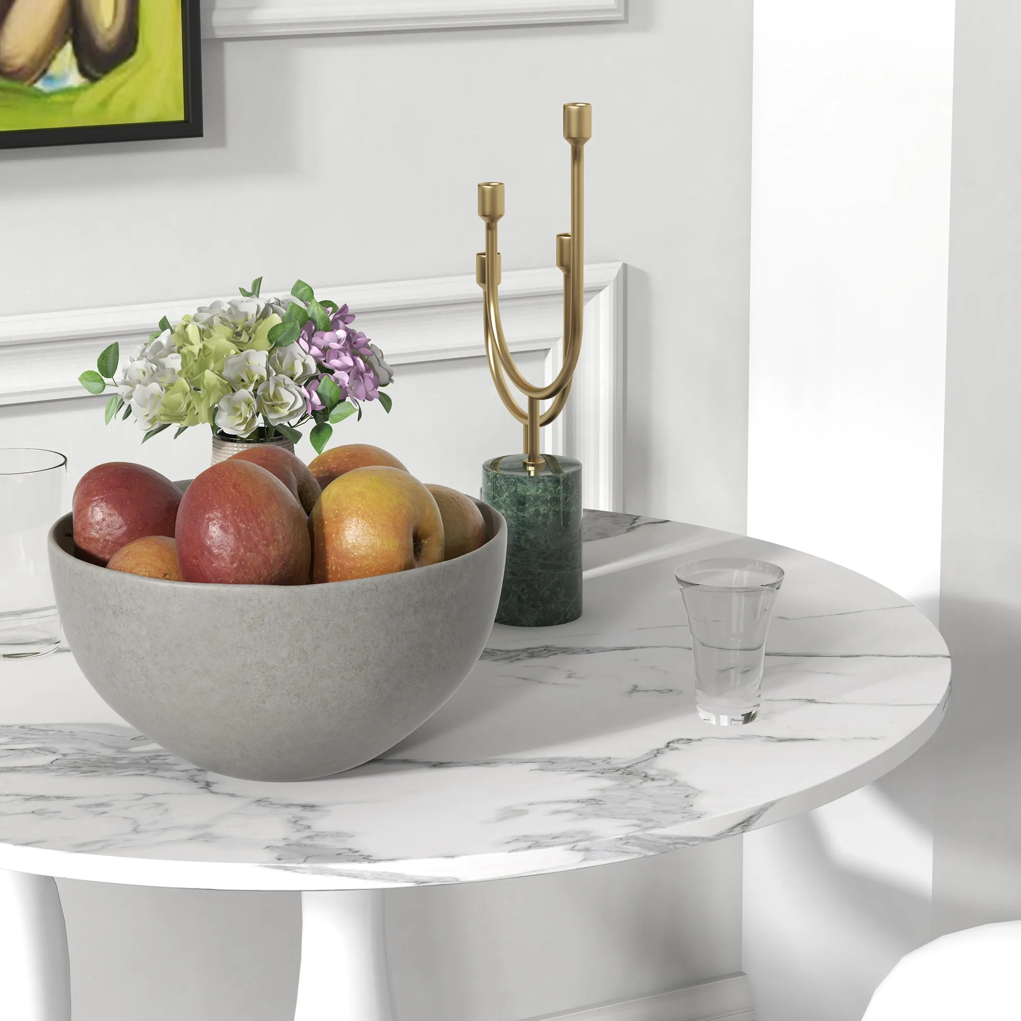 Genießen Sie entspannte und stilvolle Mahlzeiten mit dem Esszimmertisch. Seine elegante, runde Form und die kunstmarmorierte Oberfläche des Küchentisches verleihen ihm eine klassische Ausstrahlung. Der Rahmen des Küchentisches aus pulverbeschichtetem Stahl bietet eine solide Basis, ergänzt durch rutschfeste Fußpolster für zusätzliche Stabilität. Ideal für gesellige Stunden, egal wo.