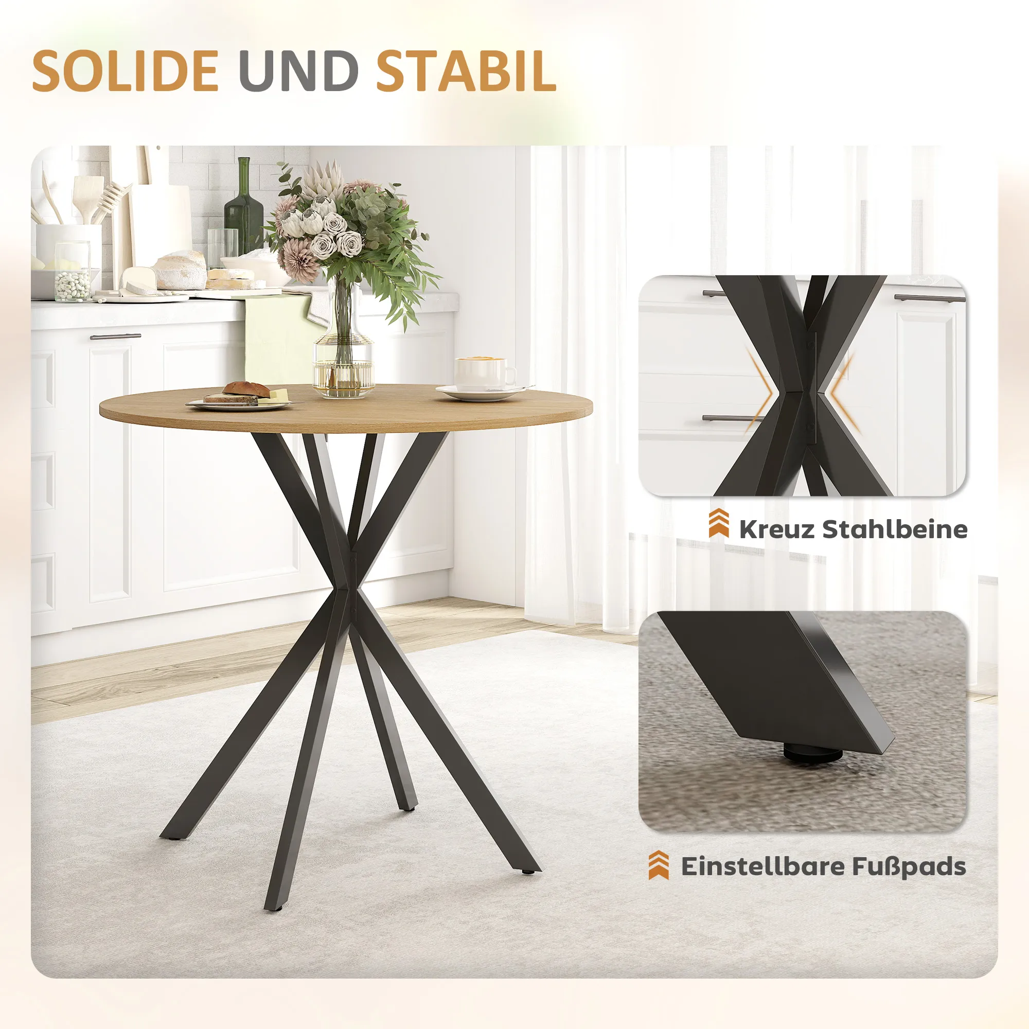 Dieser runde Esstisch verfügt über eine Oberfläche in Holzoptik und die auffälligen X-Beine bieten eine perfekte Mischung aus Gemütlichkeit und Stil. Der Küchentisch für zwei Personen eignet sich hervorragend für einen entspannten Brunch, muntere Spieleabende oder ein Dinner bei Kerzenschein. Dank verstellbarer Fußpads bleibt er auch auf unebenen Böden stabil.