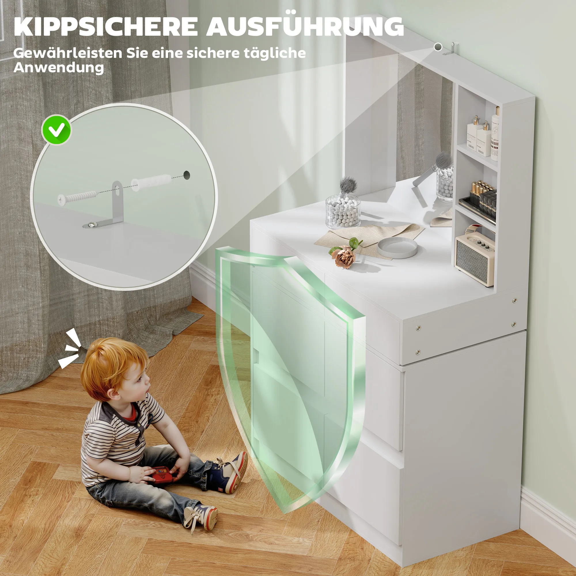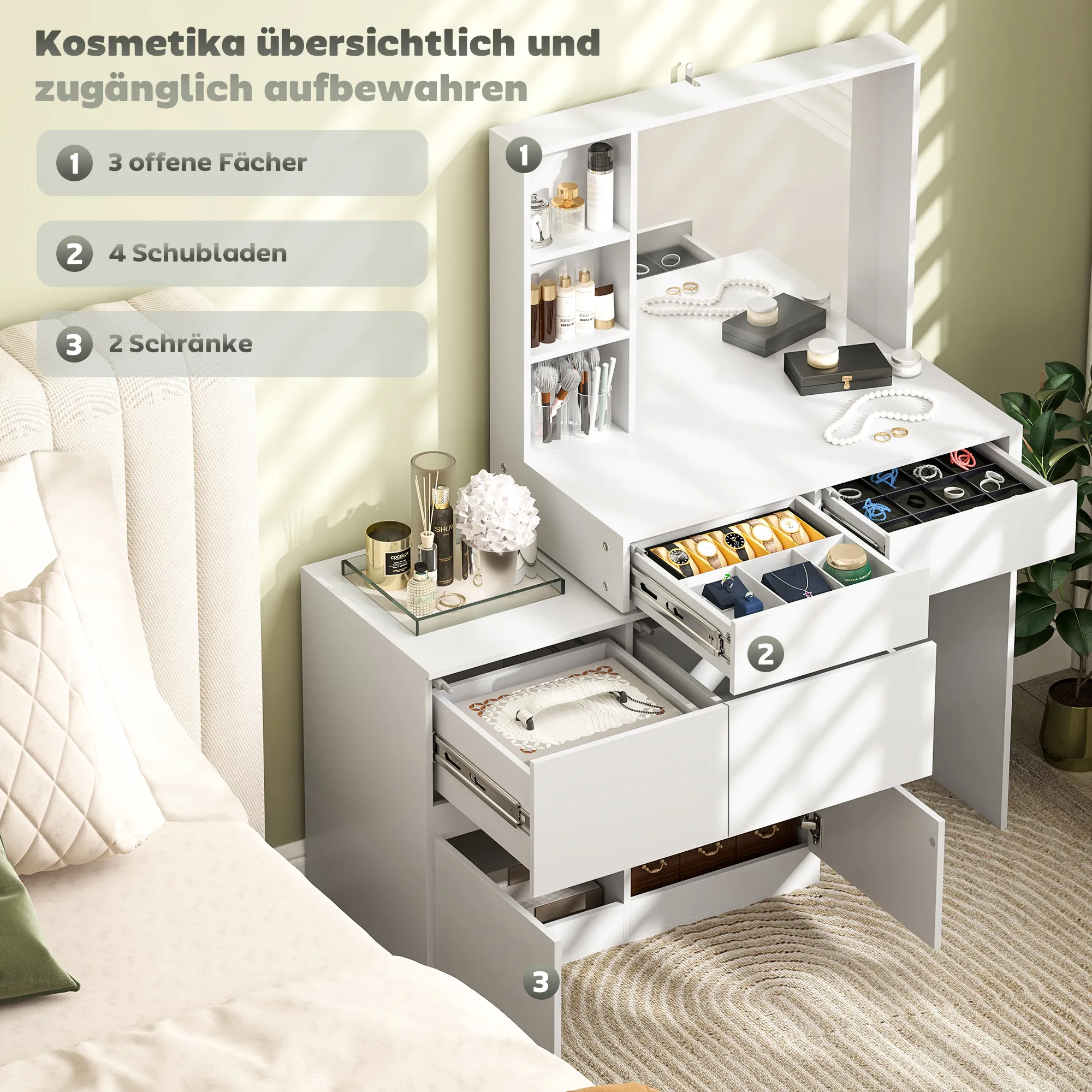 Schminktisch, Make-up-Tisch mit großem Spiegel, 4 Schubladen, 3 offene Fächer, 2 Schränke, MDF, Weiß