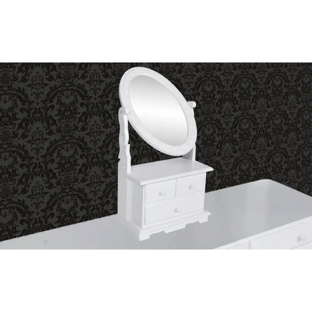 Dies ist ein schönes Möbelstück, das Ihrer Poudreuse einen Hauch von Vintage-Stil verleiht. In der Mitte befindet sich ein stilvoller ovaler Schwenkspiegel. Das untere Teil bietet zwei kleine und eine große ausziehbare Schublade, in der Sie Ihre Wertsachen aufbewahren können. Die Schubladen können zur Reinigung leicht entfernt werden. Dieser Schminktisch ist aus hochwertigem MDF gefertigt.Die warmweiße Lackierung und die feine Verarbeitung sorgen für Glanz und Eleganz. Diese Einheit kann auf Truhen oder Tischen gelegt werden. Die Lieferung enthält einen Schminktisch-Aufsatz. Überprüfen Sie unsere anderen Produkte für das passende Möbelteil! Hinweis: Da diese Möbel aus Holz handgefertigt und weiß lackiert sind, können sie kleine Unregelmäßigkeiten aufweisen.