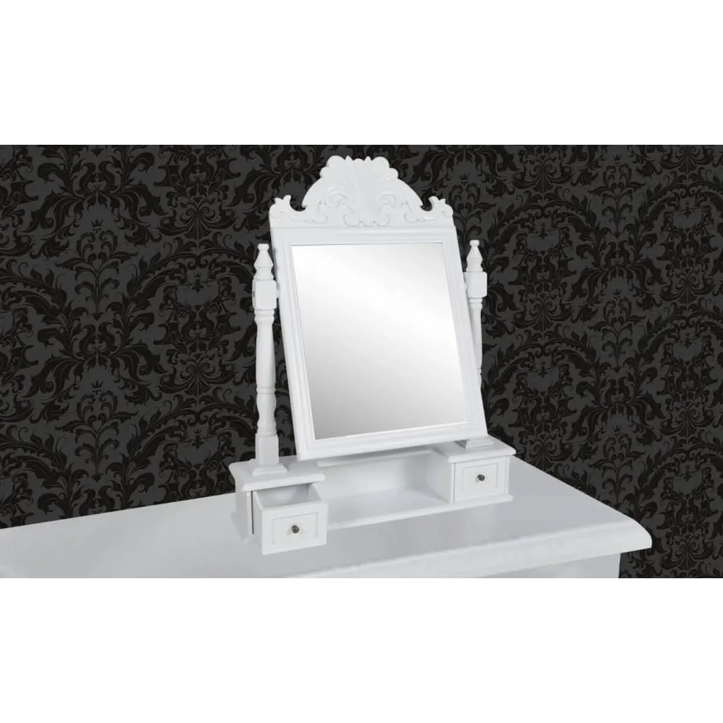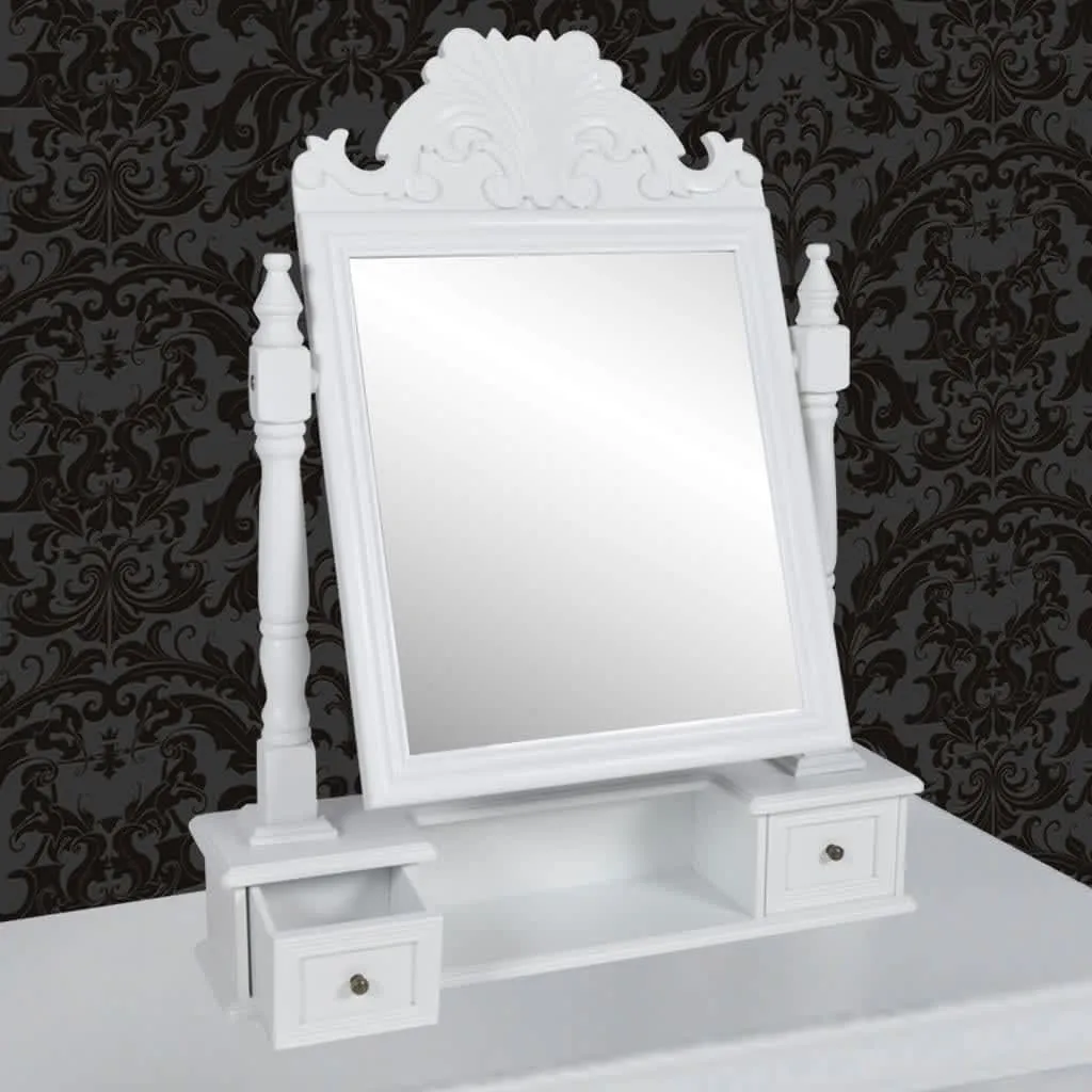 Dieser wunderschön verarbeitete Schminktisch ist mit aufwendigen Details versehen. Die Verarbeitung verleiht ihm ein klassisch-elegantes Aussehen.Ein stilvoller quadratischer Spiegel ist in der Mitte angebracht. Dieser kann bei Bedarf geschwenkt werden. Das Unterteil enthält zwei kleine Schubladen, in denen Sie Ihre Wertsachen aufbewahren können. Dieser Schminktisch-Aufsatz ist aus hochwertigem MDF gefertigt. Er kann auf Truhen oder Tischen verwendet werden. Die Lieferung enthält 1 Schminktisch-Aufsatz mit zwei Schubladen und 1 Spiegel.Hinweis: Da diese Möbel handgefertigt, aus Holz und weiß lackiert sind, können sie kleinere Mangel aufweisen.