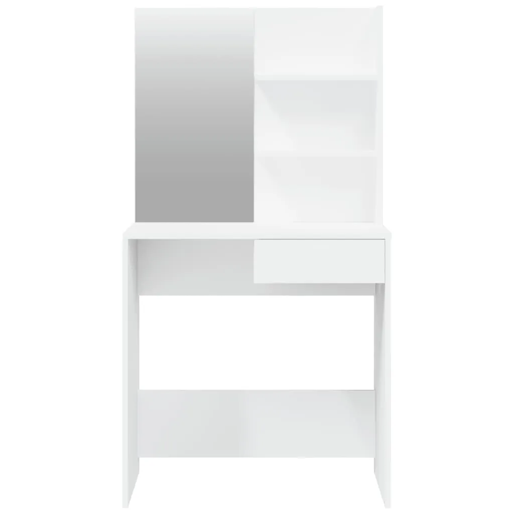 Mit seinen raffinierten geraden Linien und seiner asymmetrischen Form voller Originalität wird dieser Schminktisch mit Sicherheit alle Blicke auf sich ziehen! Stabiles Material: Holzwerkstoff ist ein Material hoher Qualität mit glatter Oberfläche, das sich durch Festigkeit, Stabilität und Feuchtigkeitsbeständigkeit auszeichnet.Allzweckspiegel: Der Schminktisch mit Spiegel eignet sich perfekt für deine tägliche Schönheitsroutine. Der Spiegel ermöglicht es dir, deine Gesichtshaut zu pflegen und auch dein Make-up aufzutragen!Reichlich Stauraum: Die Tischplatte, die zwei Ablagen über dem Tisch und eine Schublade unter dem Tisch bieten reichlich Platz für Make-up, Schmuck und andere Alltagssachen.Modernes Design: Durch klare Linien, minimalistischen Look und modernes Design fügt er sich harmonisch in deine Inneneinrichtung ein. Warnung:Um das Umkippen zu verhindern, muss dieses Produkt mit der mitgelieferten Wandhalterung gesichert werden. Hinweis:Jedes Produkt wird mit einer Montageanleitung in der Verpackung für eine einfache Montage geliefert.