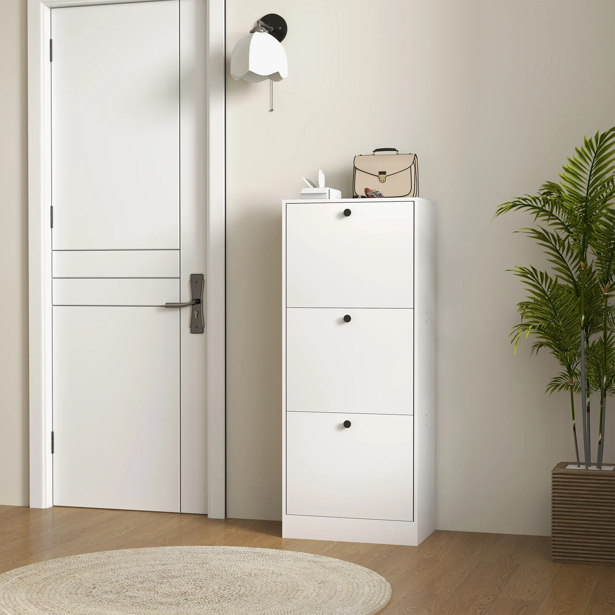 Bewahren Sie Ihre Schuhe stilvoll und ordentlich im Schuhschrank auf. Das schlanke Design der Schuhaufbewahrung mit schwarzen, runden Griffen und drei Fächern bietet Platz für bis zu 12 Paar Schuhe. Geeignet für enge Räume, lässt sich dank verstellbarer Regale leicht anpassen. Die Wahl für ein elegantes Zuhause!