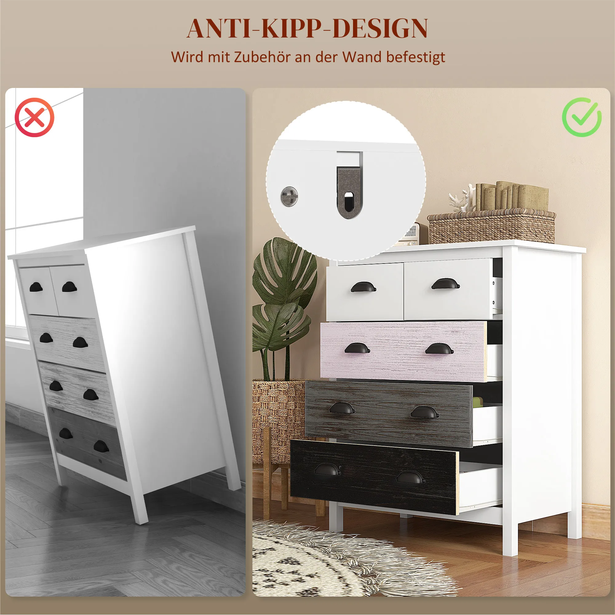 - â Kippschutz der Kommode sorgt für zusätzliche Standfestigkeit