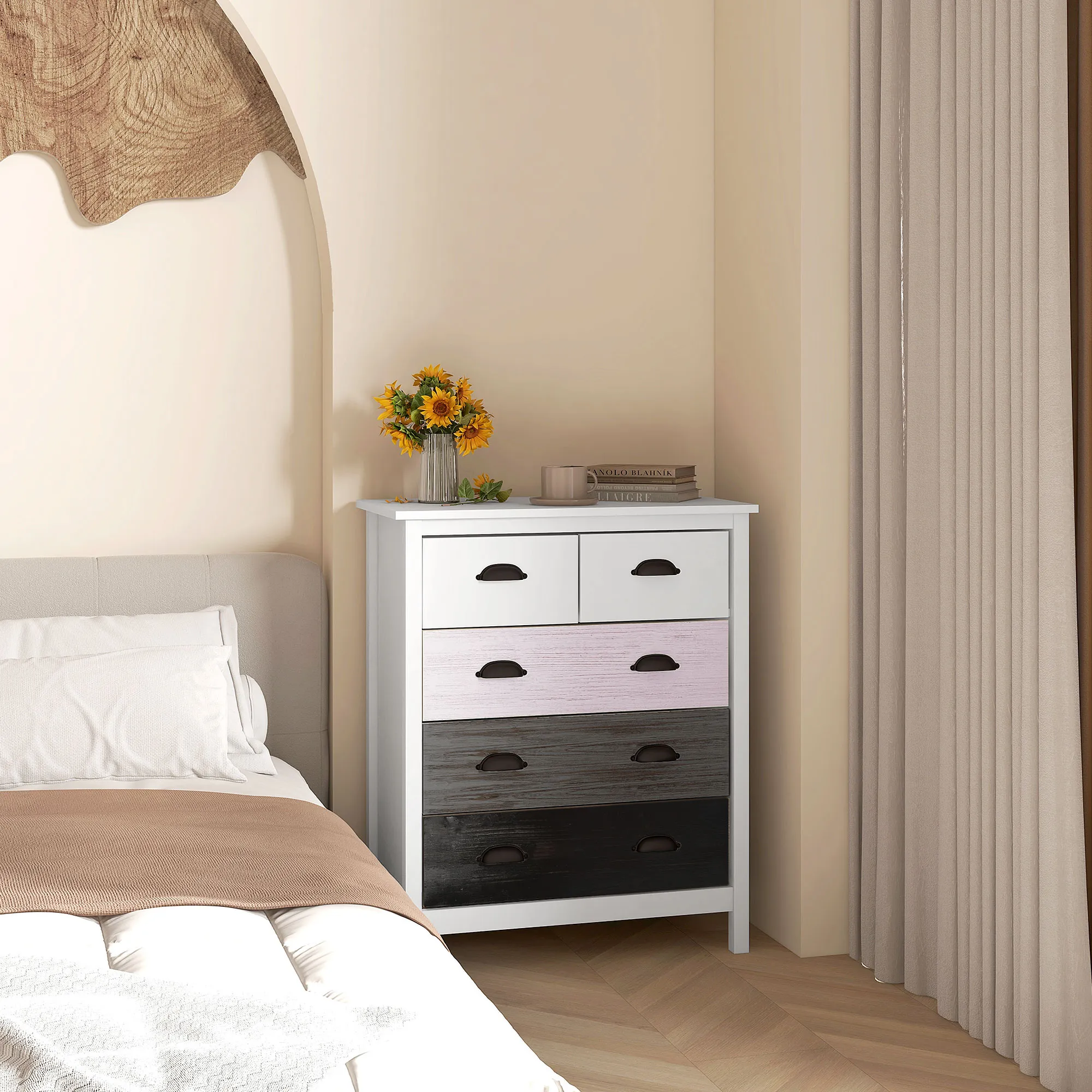Erwecken Sie Ihr Zuhause mit dieser unwiderstehlich charmanten Kommode zum Leben! Das schicke Design des Schubladenschranks in zeitlosen Farben fügt sich nahtlos in Ihr Dekor ein und bietet groÃzügigen Stauraum mit drei groÃen und zwei kleinen Schubladen. Halten Sie Ihre Kleidung, Bücher und Brettspiele ordentlich verstaut, während Sie gleichzeitig den vorhandenen Platz perfekt ausnutzen - eine geschmackvolle und stilsichere Kombination aus Ãsthetik und Funktion!