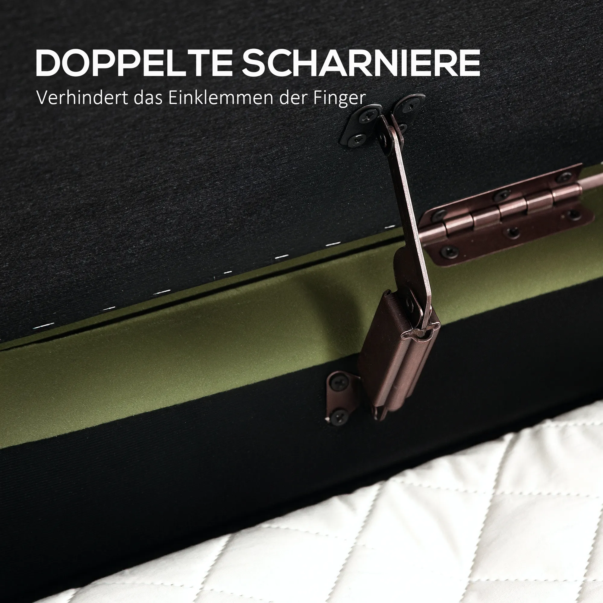 Sitzbank mit Klappdeckel und Stauraum, Stoffbezug, Holz, Metall, Dunkelgrün+Goldfarben