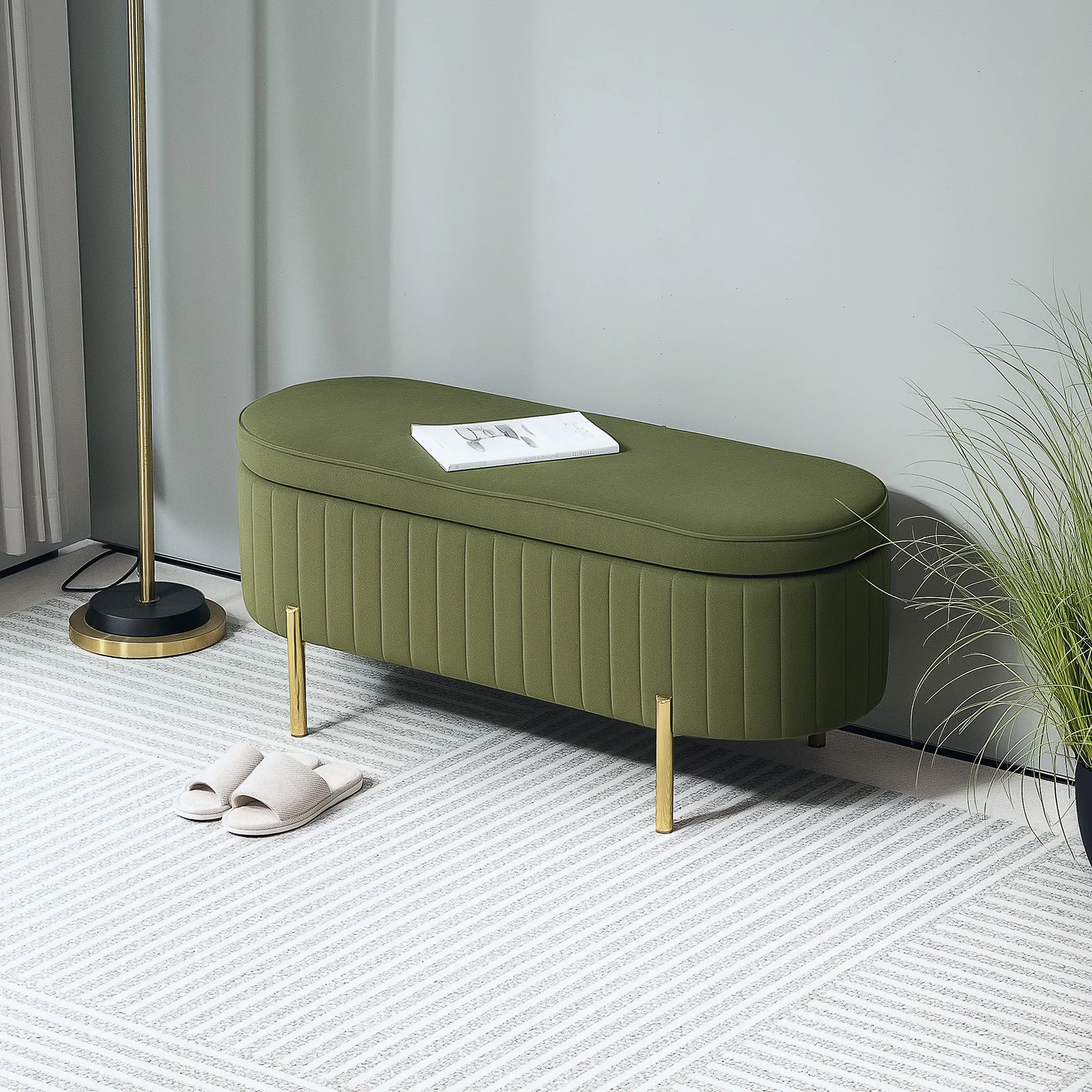 Beleben Sie jeden Raum mit der ovalen Bank, die elegantes Kanal-Tufting und schicke goldene Beine aufweist. Ideal als Bettbank, Flurbank oder gemütlicher Fensterplatz, vereint sie Stil mit Praktikabilität. Der versteckte Stauraum unter der klappbaren Sitzfläche und die samtweiche, Schaumstoff-gepolsterte Oberfläche der Polsterbank bieten Komfort und Luxus. Eine perfekte Kombination aus Eleganz und Funktionalität!