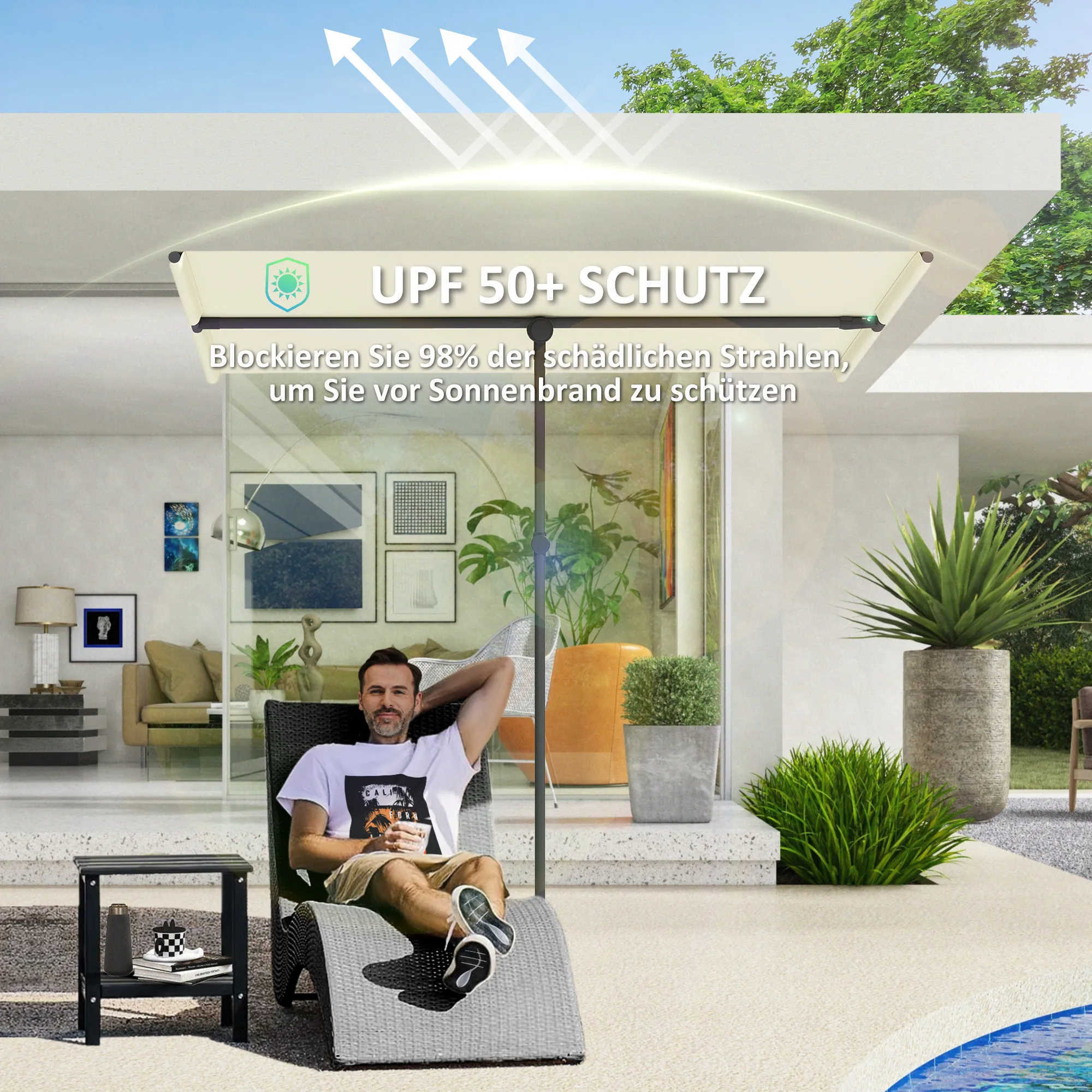 - Der Sonnenschirm bietet exzellenten UV-Schutz bis UPF 50+ und blockiert 98% der UV-Strahlen.