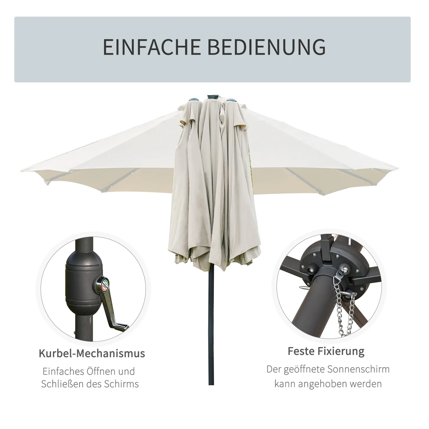 Lassen Sie Ihren Garten oder Terrasse mit diesem doppelten Sonnenschirm von erstrahlen! Der geschmackvoll designte Sonnenschirm verfügt über 36 LED-Leuchten, die an den Streben angebracht sind, sodass Sie auch bei Dunkelheit genug Licht zum Lesen oder für andere Hobbys haben. Tagsüber schützt Sie der große Doppel-Gartenschirm vor direkter Sonneneinstrahlung. Wenn Sie Ihren Garten verschönern möchten, dann ist dieser Gartenschirm genau die richtige Wahl.