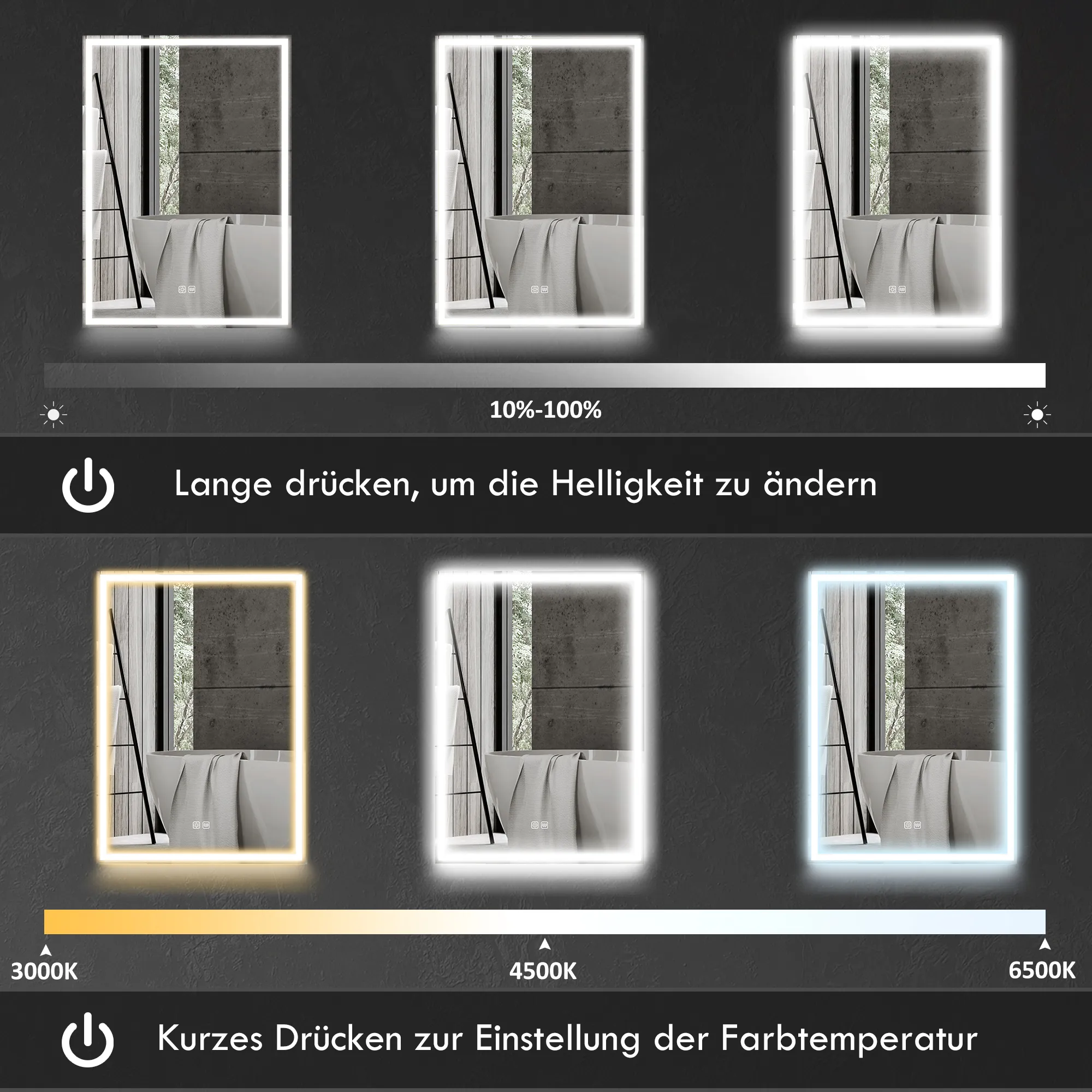 - Leistung: 30W (gesamt), 18W (Licht), 12W (Beschlagfrei)
