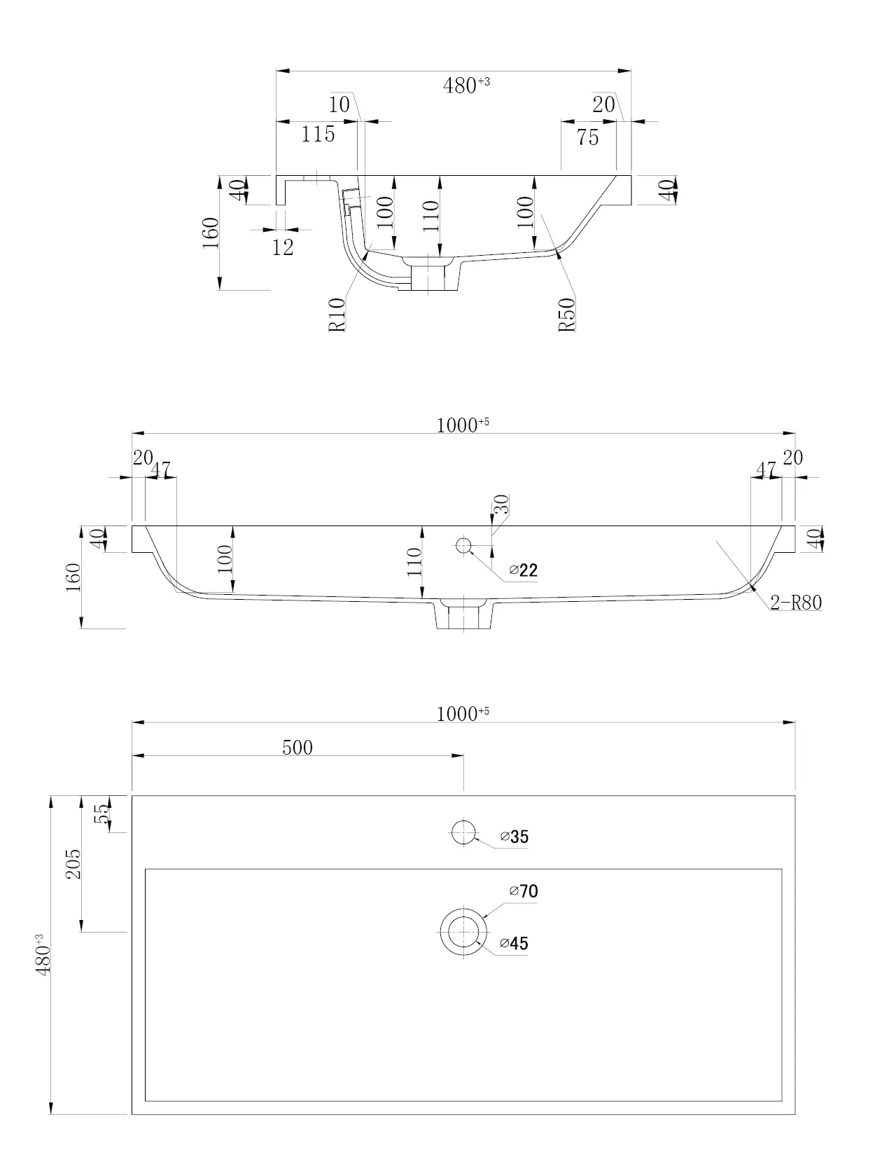 Waschbecken Mineralguss: (B/H/T) 100/4/48 cm..