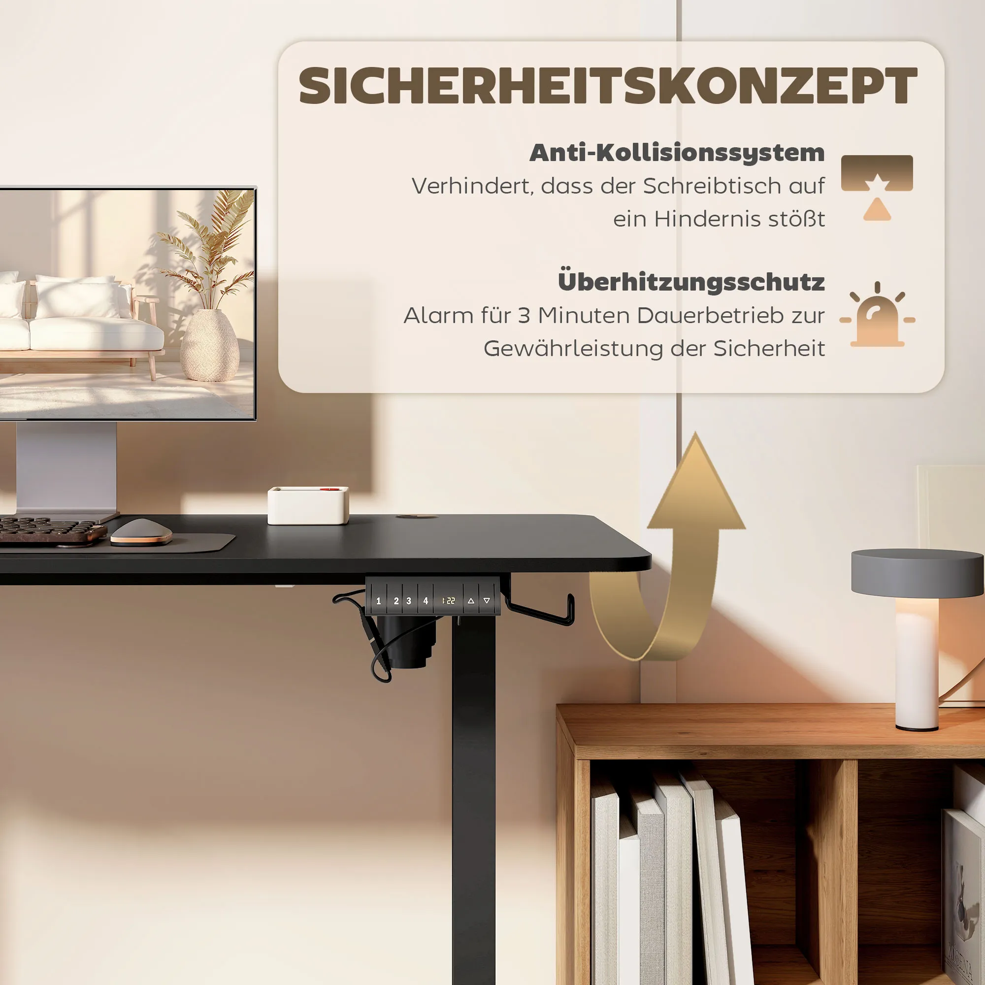 Verwandeln Sie Ihren Arbeitsplatz mit dem elektrischen Stehpult , einem höhenverstellbaren Schreibtisch, der ganz auf Ihren Komfort abgestimmt ist. Mit 4 voreingestellten Optionen von 72 cm bis 116 cm war es noch nie so einfach, Ihren ergonomischen Sweet Spot zu finden. Außerdem sorgen das Kollisionsschutzsystem und der Überhitzungsschutz für Ihre Sicherheit, während die großzügige Arbeitsfläche von 140 x 70 cm und das clevere Kabelmanagement für einen funktionalen Arbeitsplatz sorgen.