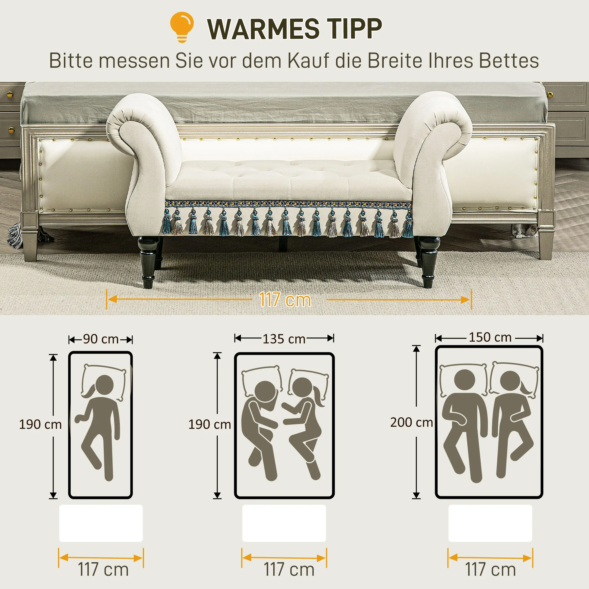 Verleihe deinem Zuhause einen Hauch von Eleganz mit dieser stilvollen Sitzbank. Ihr luxuriöses Vintage-Design, gekennzeichnet durch die schöne Knopfheftung und geschwungene Formen, zitiert die Ästhetik vergangener Epochen. Gefertigt aus robustem Massivholz, garantiert diese Bettbank Stabilität und Langlebigkeit.