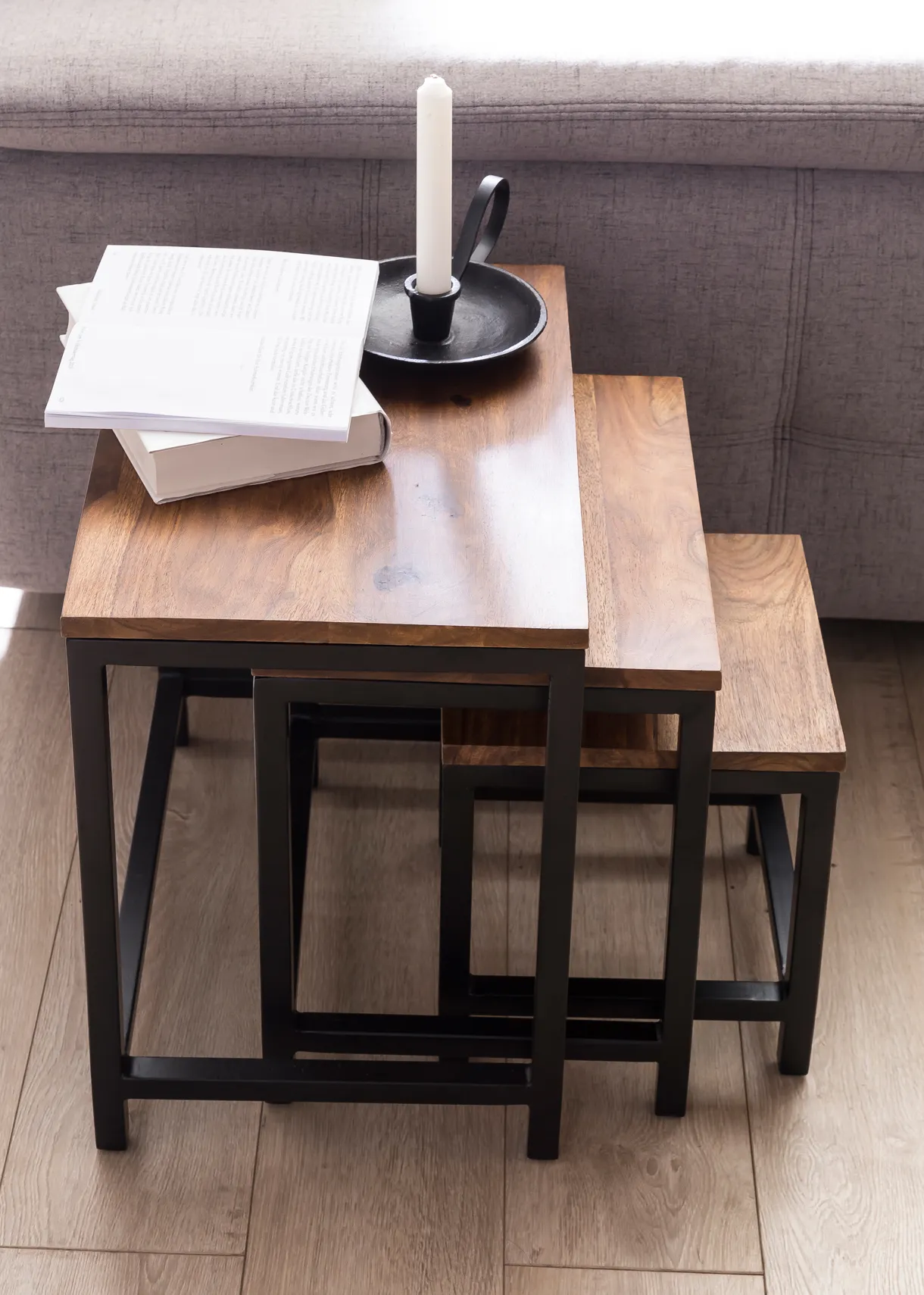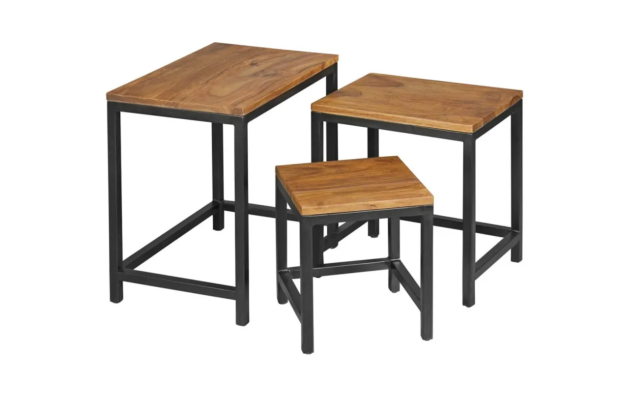 tinkaro 3er-Set Beistelltisch eckig ROSWITA Sheesham Massiv-Holz Satztische Braun