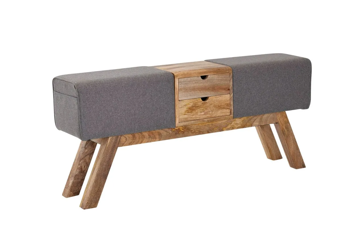 Unsere Sitzbank SEMO ist ein wunderschöner Hocker in Turnbockoptik aus Stoff und Holz. Die Sitzbank zeichnet sich durch Ihre stabile Bauweise aus Mangoholz aus, mit massiven Beinen. Die Belastbarkeit beträgt 200 kg. Durch die praktischen Schubladen und die Seitentasche können kleine Utensilien direkt vor Ort aufbewahrt werden. Jedes Produkt wird handgefertigt, sodass du ein absolutes Unikat erhältst und die Holzmaserung bei jedem Produkt einzigartig ist. Die Holzbank eignet sich hervorragend als Flurmöbel und Garderobenbank.