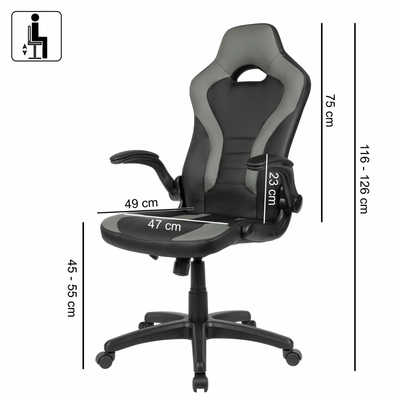 - Armlehnenhöhe (von der Sitzfläche ausgehend): 23 cm