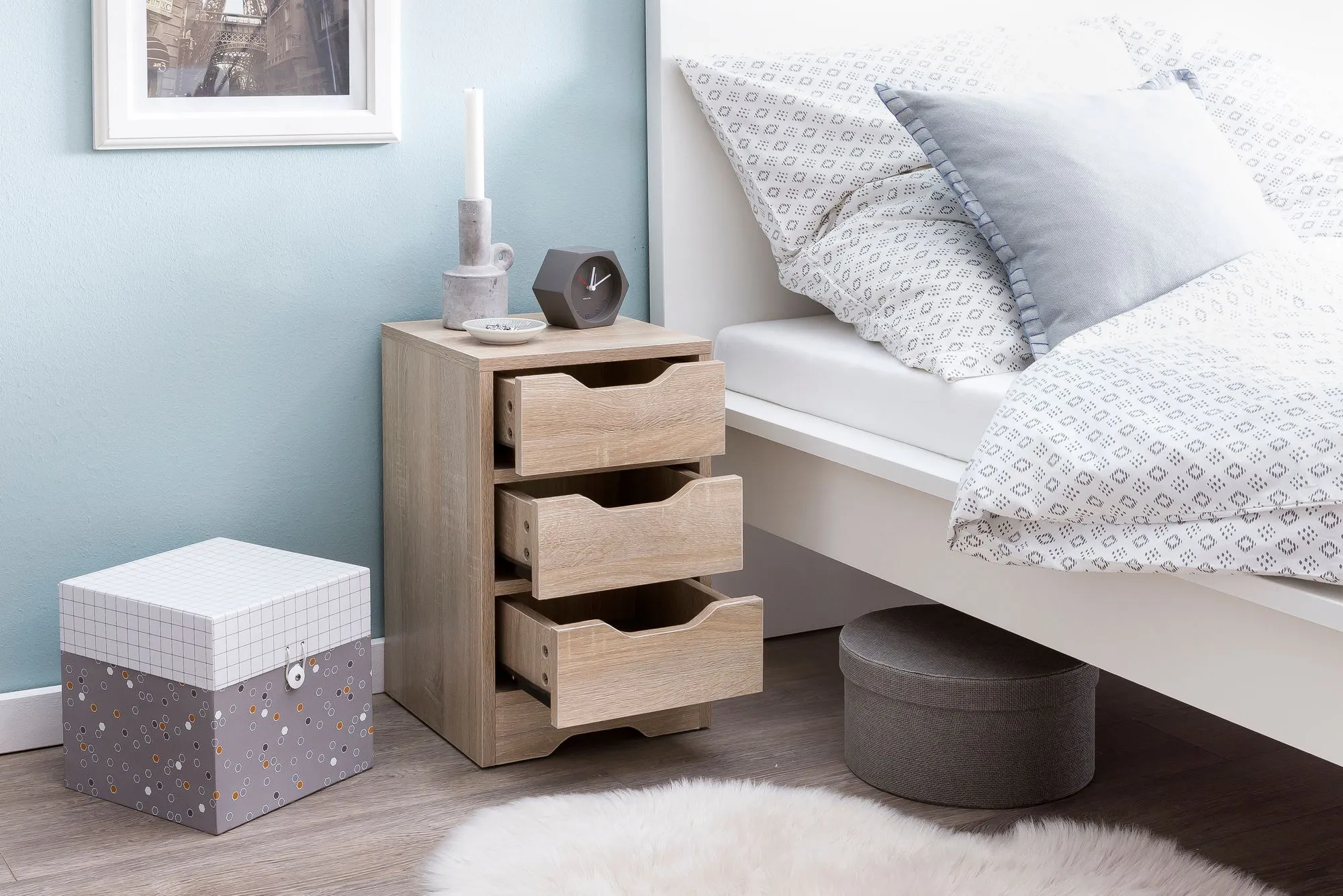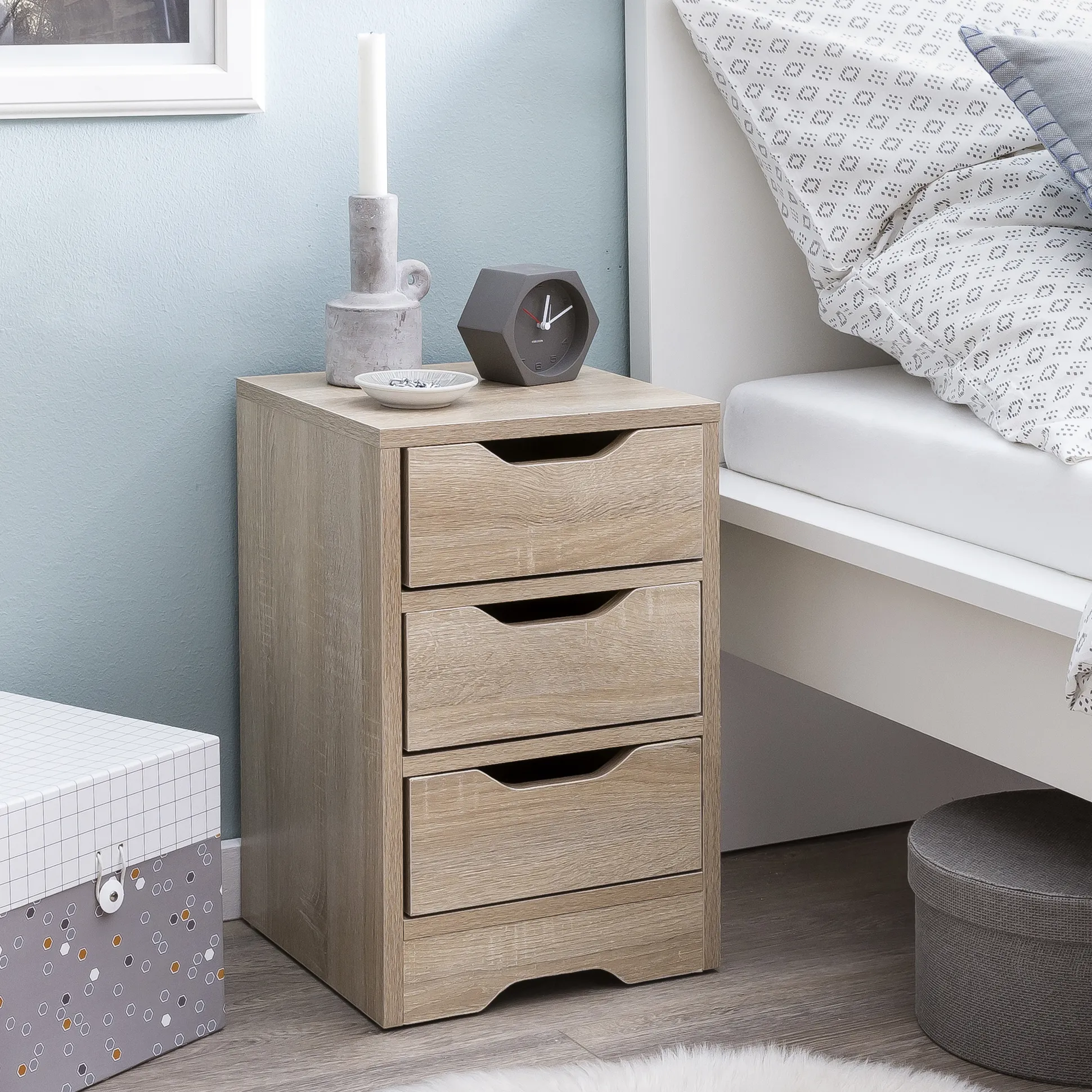 - Nachtkästchen mit drei Schubladen