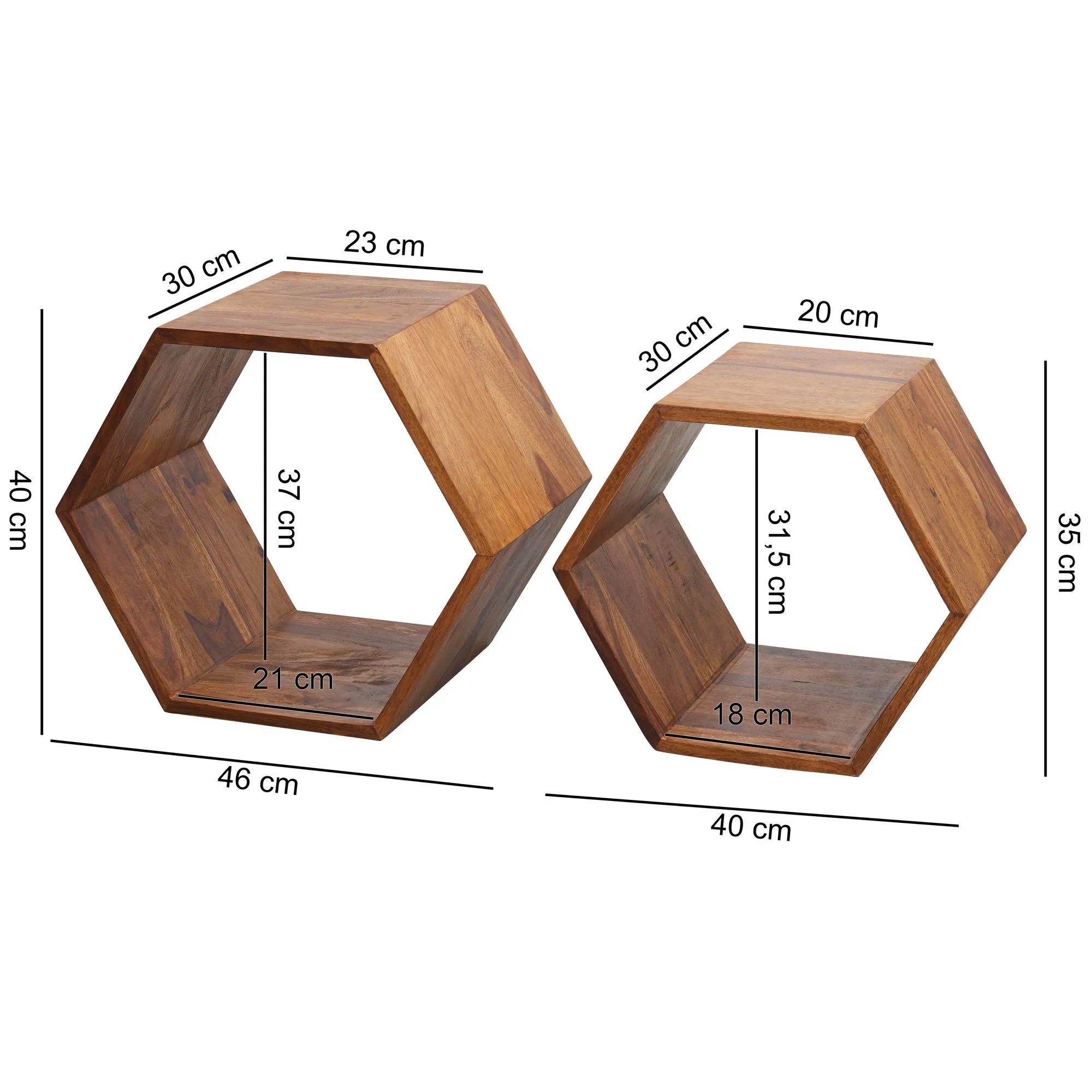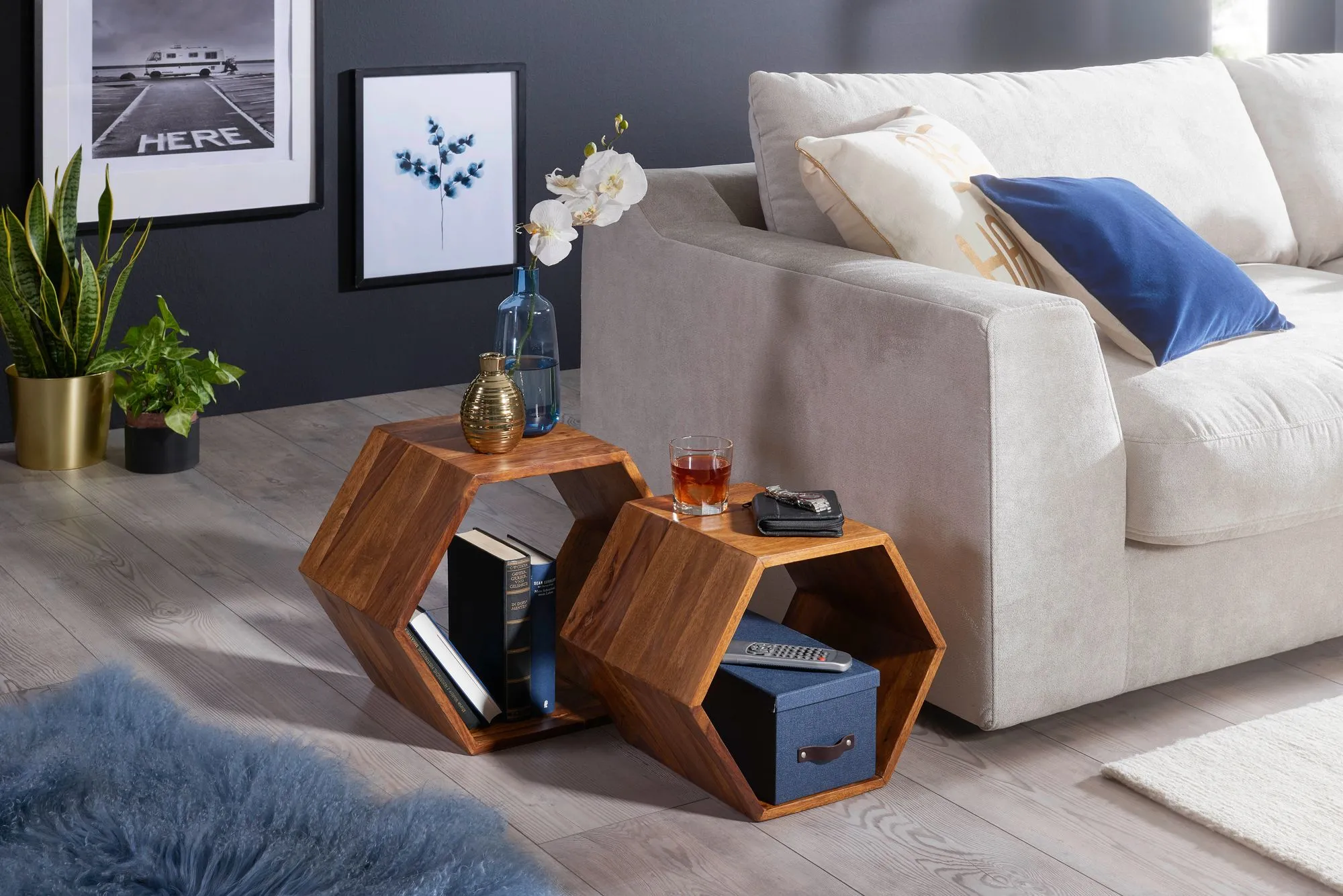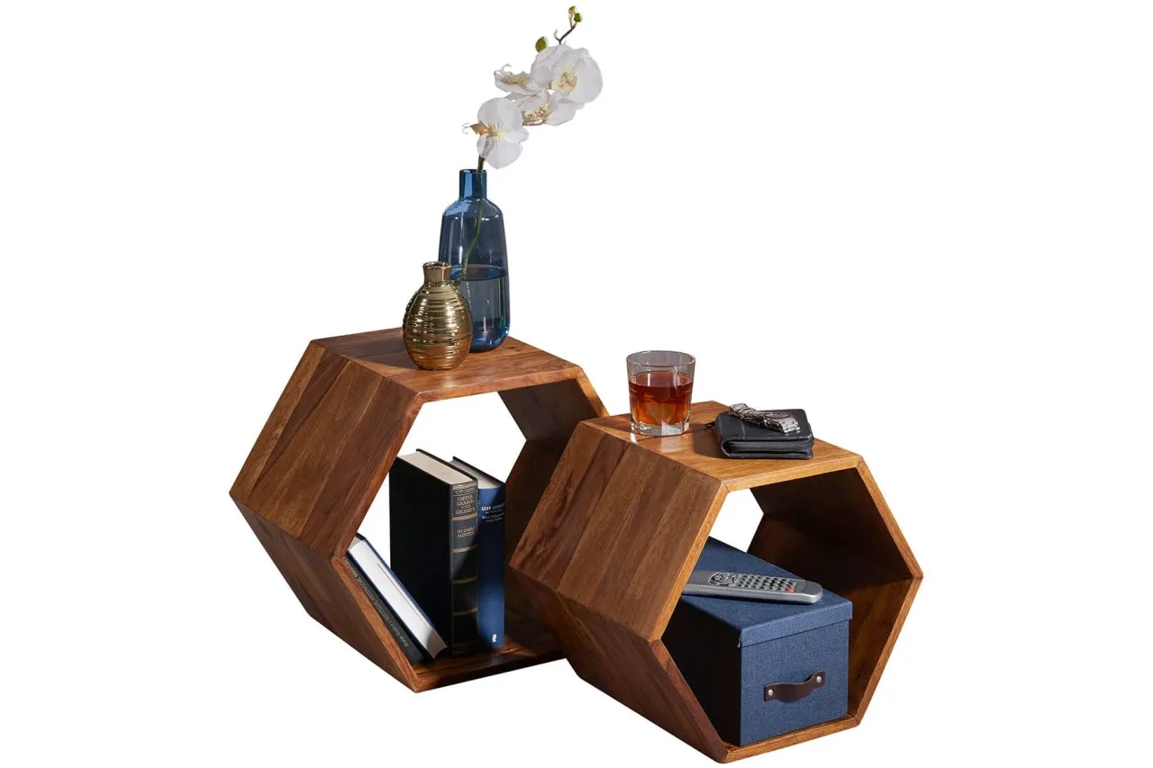 tinkaro Beistelltisch 2er Set KODRAN Waben-Form Sheesham Massivholz Wohnzimmertisch Braun