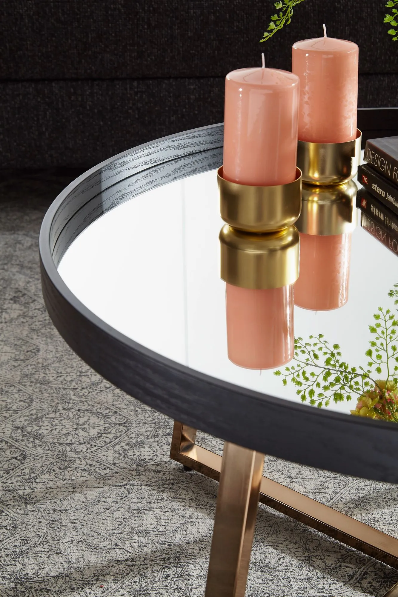- Spiegelnde Tischplatte auf goldfarben lackiertem Metallgestell