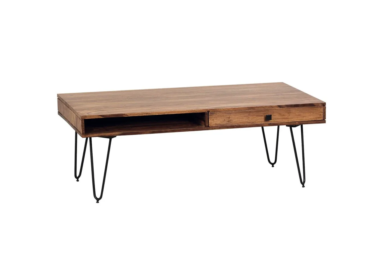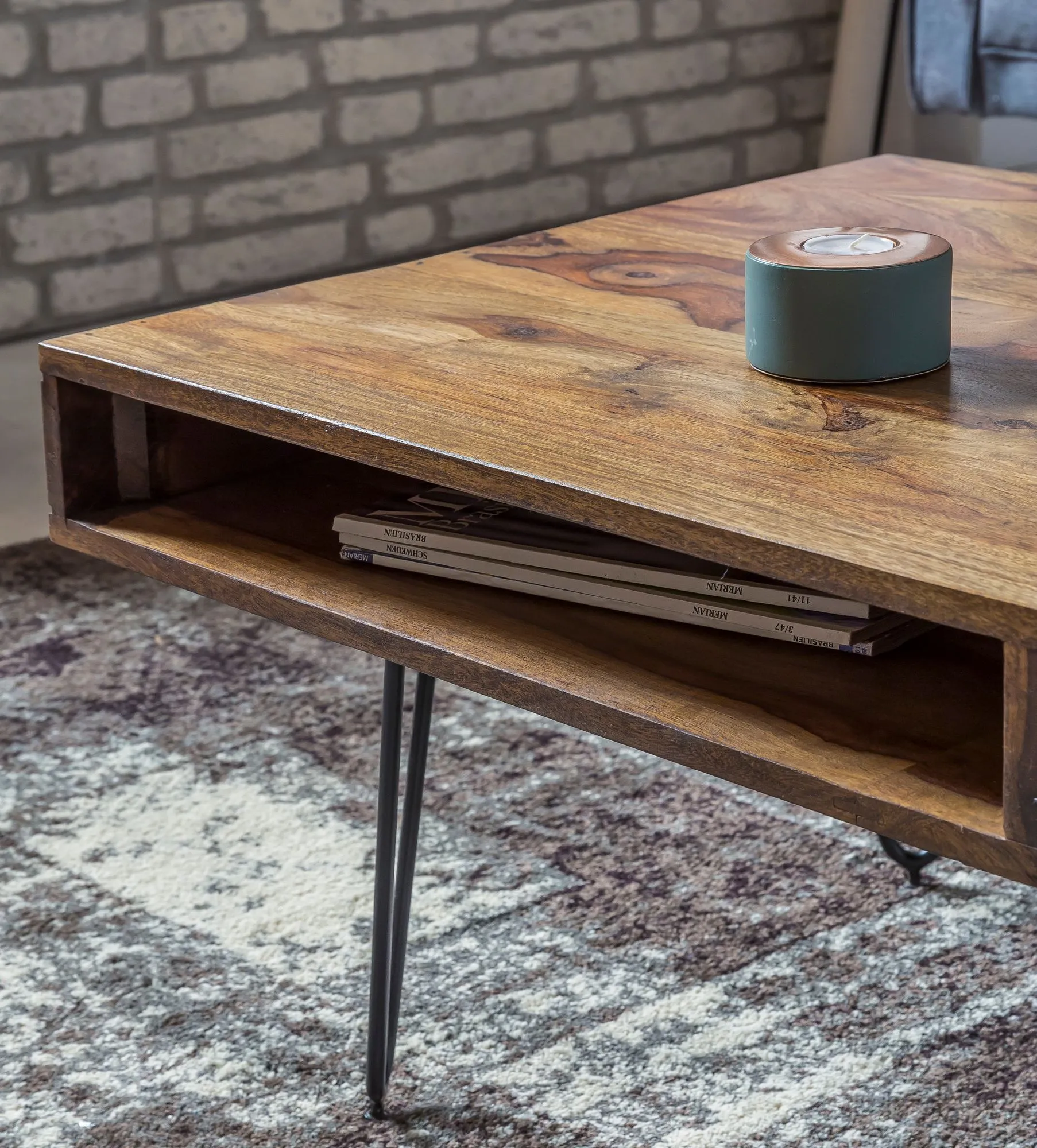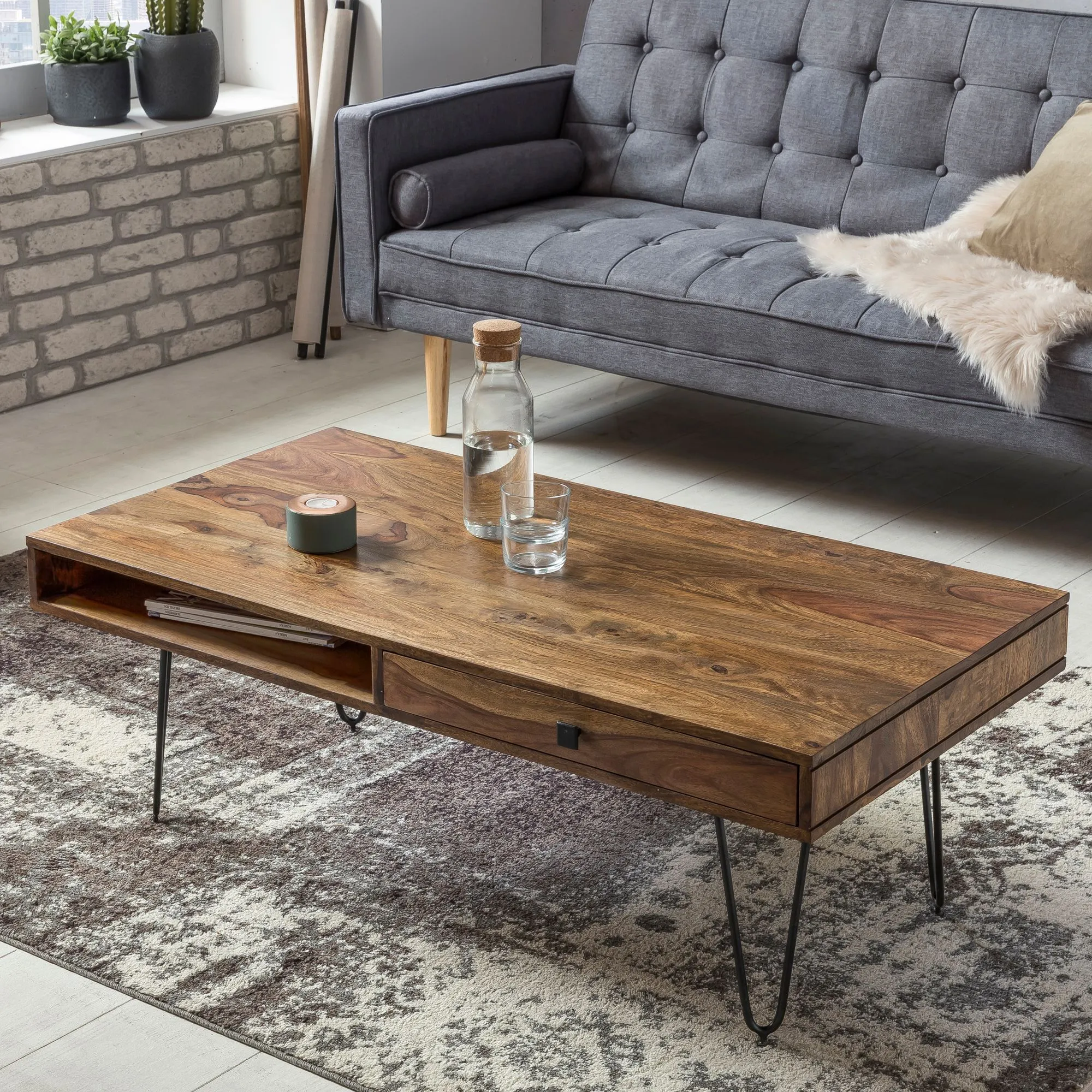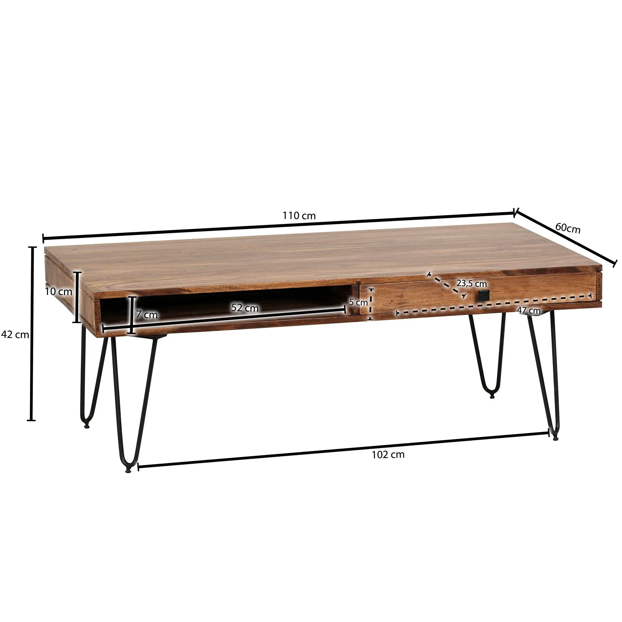 Unser Couchtisch KARU aus unserer sehr beliebten KARU-Serie ist ein toller Sofatisch aus massivem Sheeshamholz im Materialmix. Durch die Kombination Sheesham Holz und Metall entsteht ein toller industrieller und moderner Look, der sich vielen Wohnstilen anpassen kann. Der Tisch lässt sich super flexibel einsetzen und besitzt durch seine 110 x 60 cm Fläche eine schöne große Ablagefläche. Durch die tollen Schubläden können viele Utensilien im Holz-Couchtisch aufbewahrt werden. Das Produkt ist in liebevoller Handarbeit gefertigt, daher in Maserung und Verarbeitung einzigartig und ein absolutes Unikat.