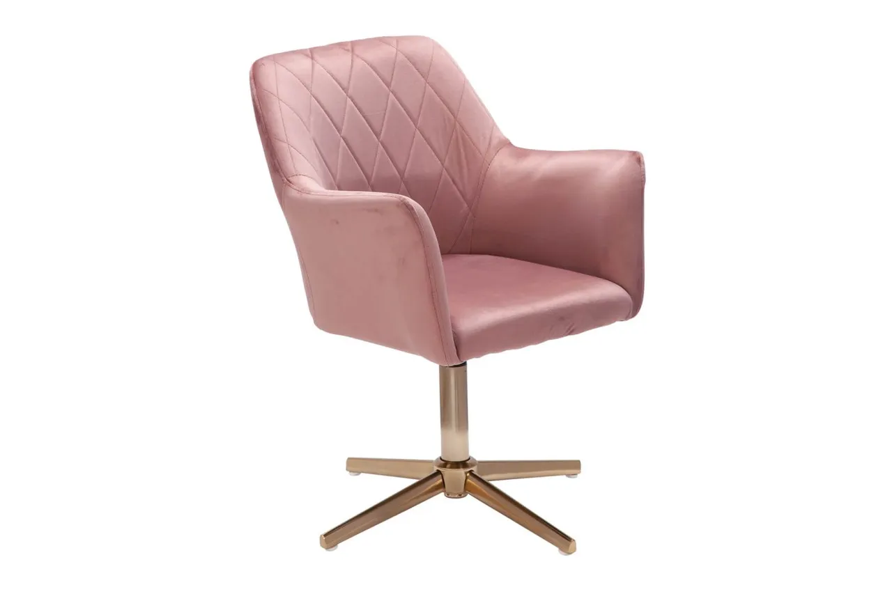 Unser Drehstuhl KLARA ist ein richtiger Hingucker in jedem Raum. Durch seinen schönen Bezug in Rosa und dem goldenen Stand aus Eisen, wirkt der Stuhl sehr modern und macht eine tolle Figur, egal ob für den heimischen Arbeitsplatz, die Küche, das Wohnzimmer oder als Schminkstuhl. Dank der 360° Drehfunktion ist der Stuhl sehr flexibel einsetzbar. Die schöne Polsterung sorgt für ein tolles Sitzgefühl. Auch die Arme können auf die weiche Polsterung abgelegt werden. Die Absätze aus Gummi schützen deinen Boden. Der Stuhl ist bis 120 kg belastbar.