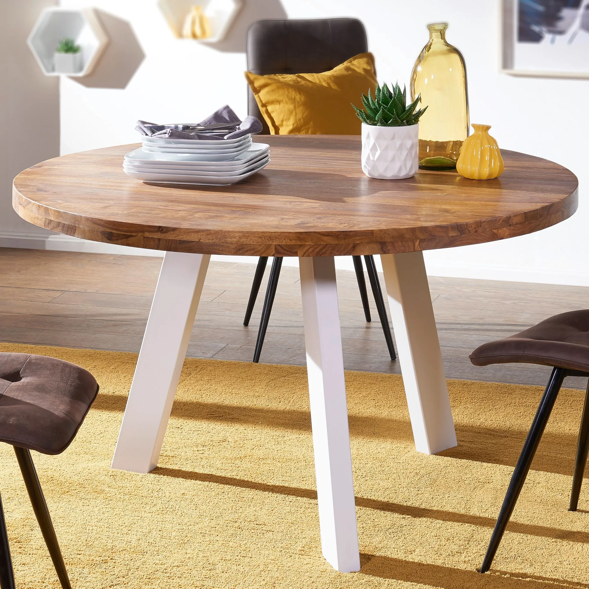 tinkaro Esszimmertisch rund AVNI Sheesham Massiv Esstisch Braun/Weiß