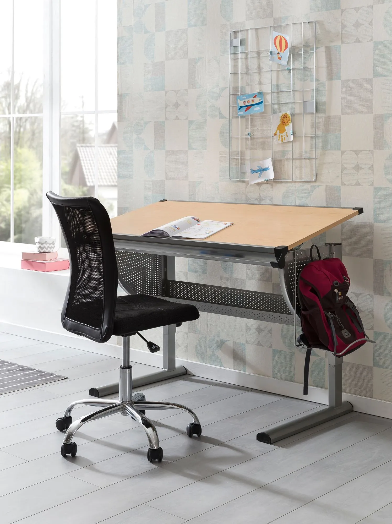 - Einen Schreibtisch inkl. Schultaschenhalterung, Ablagekorb, Stifthalterung