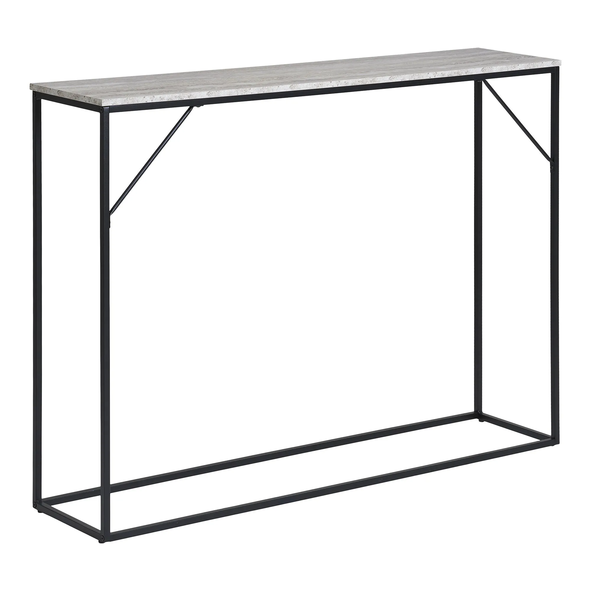 Der Konsolentisch Vita vereint modernen Stil mit funktionaler Eleganz. Mit seiner schlichten, rechteckigen Form und der robusten Bauweise ist dieser Tisch die perfekte Ergänzung für jedes zeitgenössische Zuhause. Die Farbkombination aus schwarzem Metallgestell und einer hellen Tischplatte in Betonoptik schafft einen ansprechenden Kontrast und setzt stilvolle Akzente in Ihrem Wohnraum.