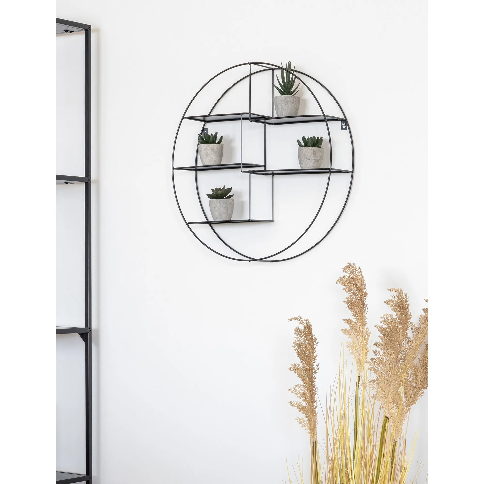 Das Wandregal Genk in Stahl schwarz ist ein kreatives und modernes Wandregal mit runder Form, das durch seine geometrische Struktur und stilvolle Ästhetik besticht. Es vereint Funktionalität und ansprechendes Design, ideal für jeden Wohnraum, um sowohl dekorative als auch praktische Gegenstände in Szene zu setzen.