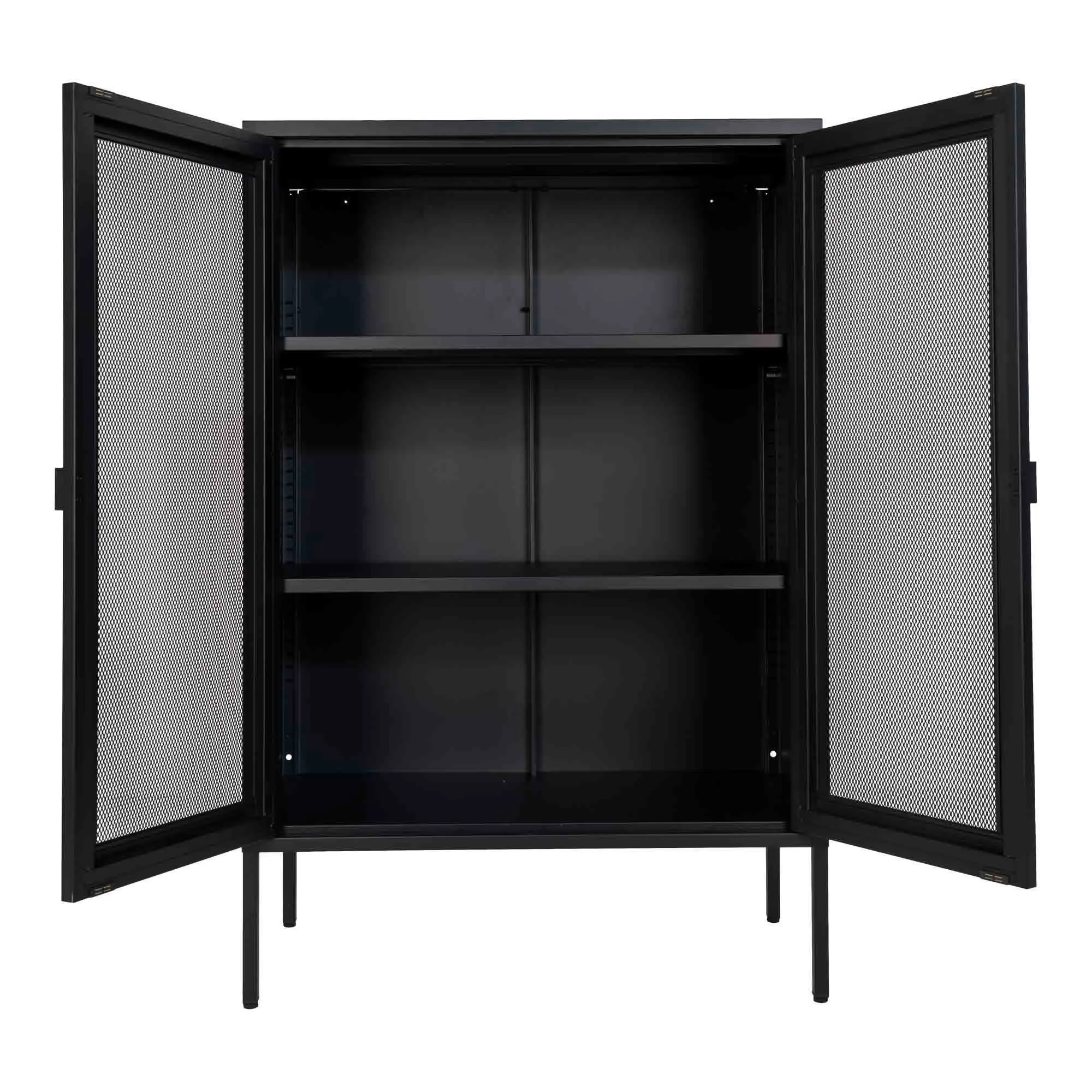 Die Vitrine Melbourne in mattem Schwarz ist ein eleganter, frei stehender Schrank, der moderne Ästhetik mit funktionalem Design vereint. Mit seinen klaren Linien und der industriellen Ausstrahlung ist er nicht nur eine praktische Aufbewahrungslösung, sondern setzt auch stilvolle Akzente in Ihrem Wohnraum.
