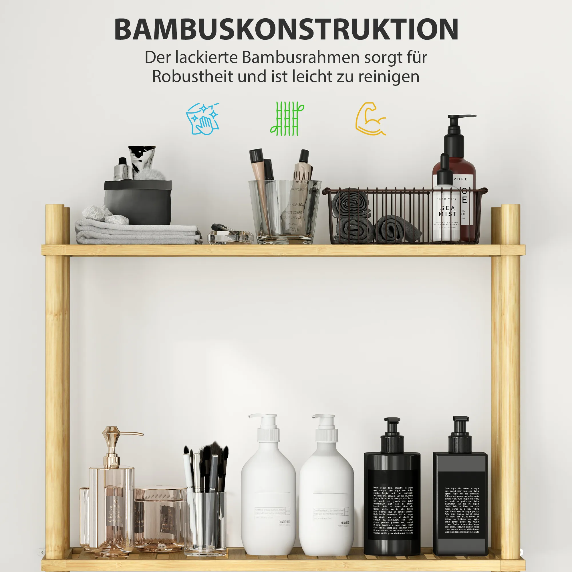 Maximieren Sie Ihren Badezimmerplatz mit dem platzsparenden Waschmaschinenregal. Perfekt über der Toilette angeordnet, umfasst dieses Regal über Waschmaschine 3 Lamellenregale für durchlüfteten, leicht erreichbaren Stauraum. Aus natürlichem Bambus mit feiner Oberfläche hergestellt, bietet dieses Badezimmerregal Umkippschutz und verstellbare Füße für erhöhte Bodenstabilität. Ideal, um Ihre Notwendigkeiten zu ordnen!