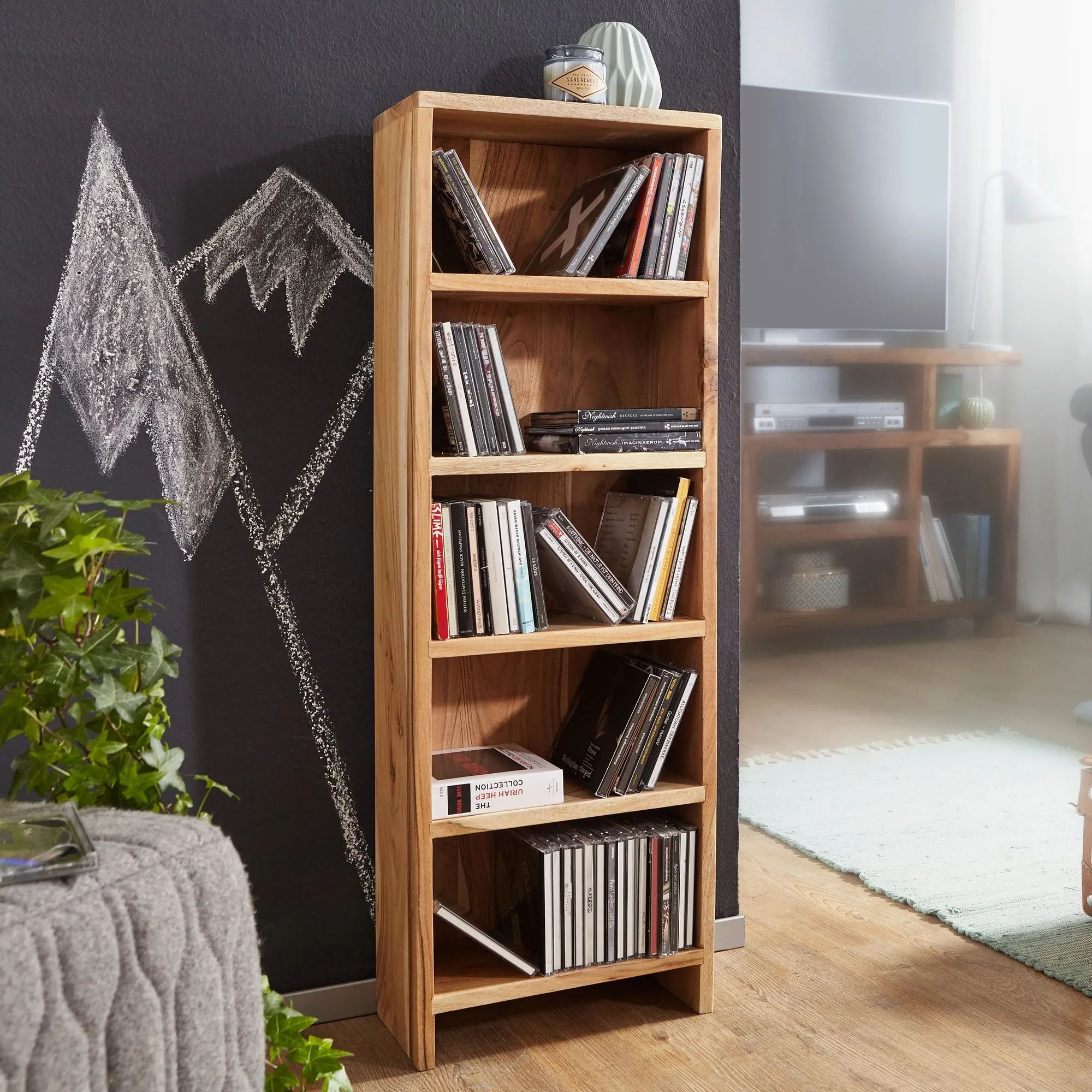 Wohnling CD Regal MUMBAI Massivholz Akazie Standregal 90 cm hoch CD-Aufbewahrung 5 Fächer Bücherregal natur Landhaus-Stil