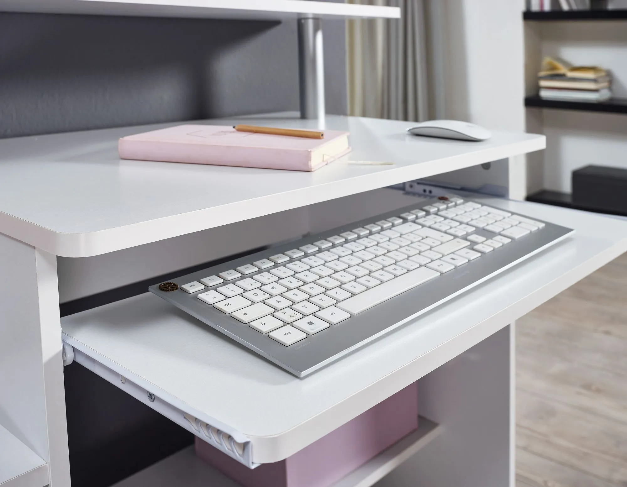 - Der Tisch bietet diverse Ablagemöglichkeiten und Tastaturauszug