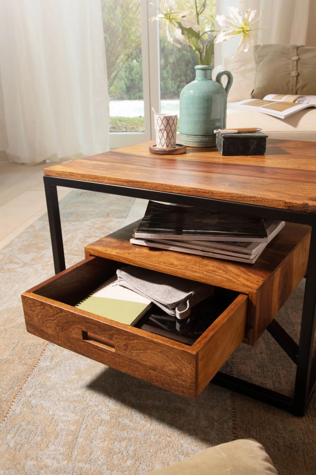 Wohnling Couchtisch 60x60x40 cm Sheesham Massivholz / Metall Sofatisch Quadratisch