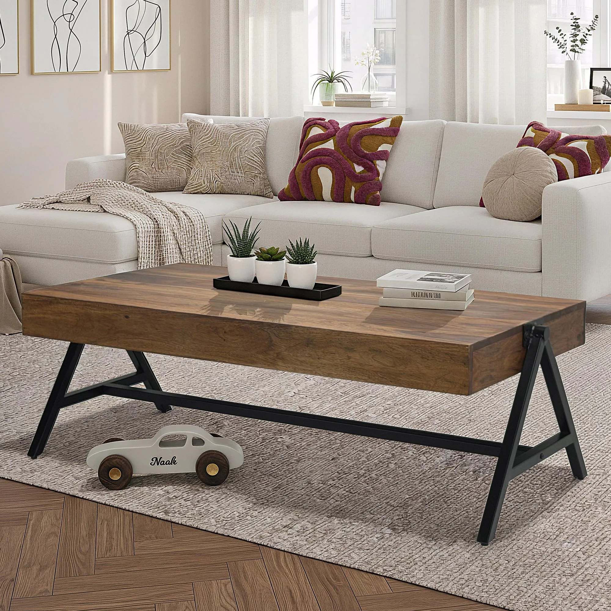- Kombination aus massivem Sheeshamholz und schwarzem Metallgestell in A-Form