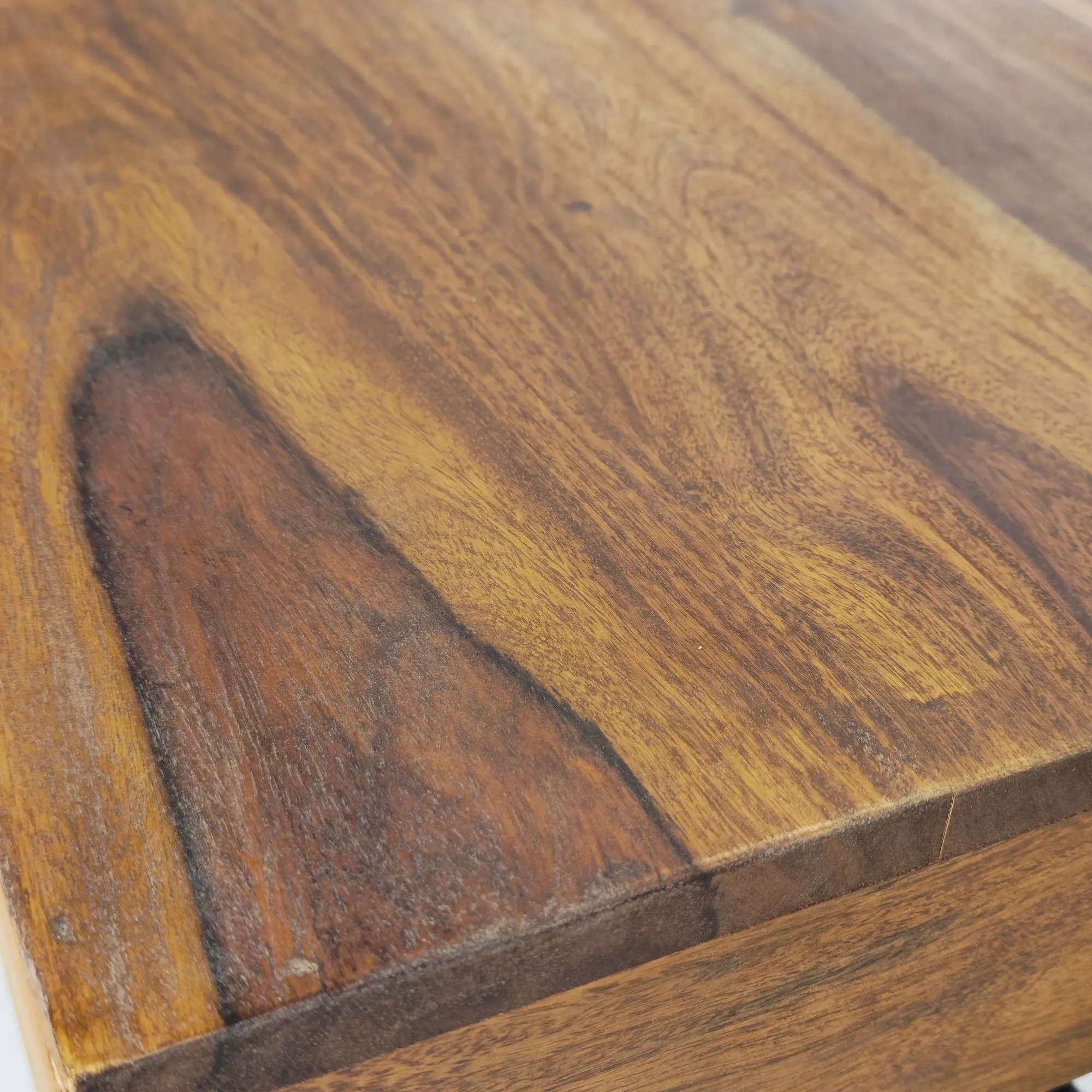 - Tischplatte: Sheesham Massivholz, mit Klarlack beschichtet