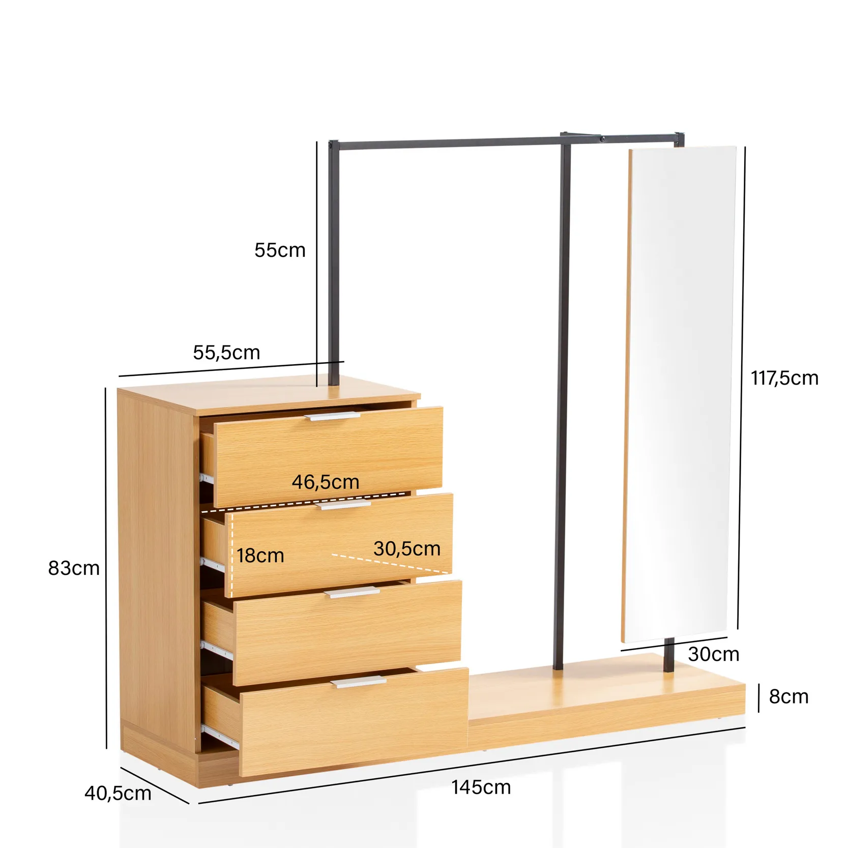 - Ausgestattet mit Kleiderstange, Kommode und Spiegel