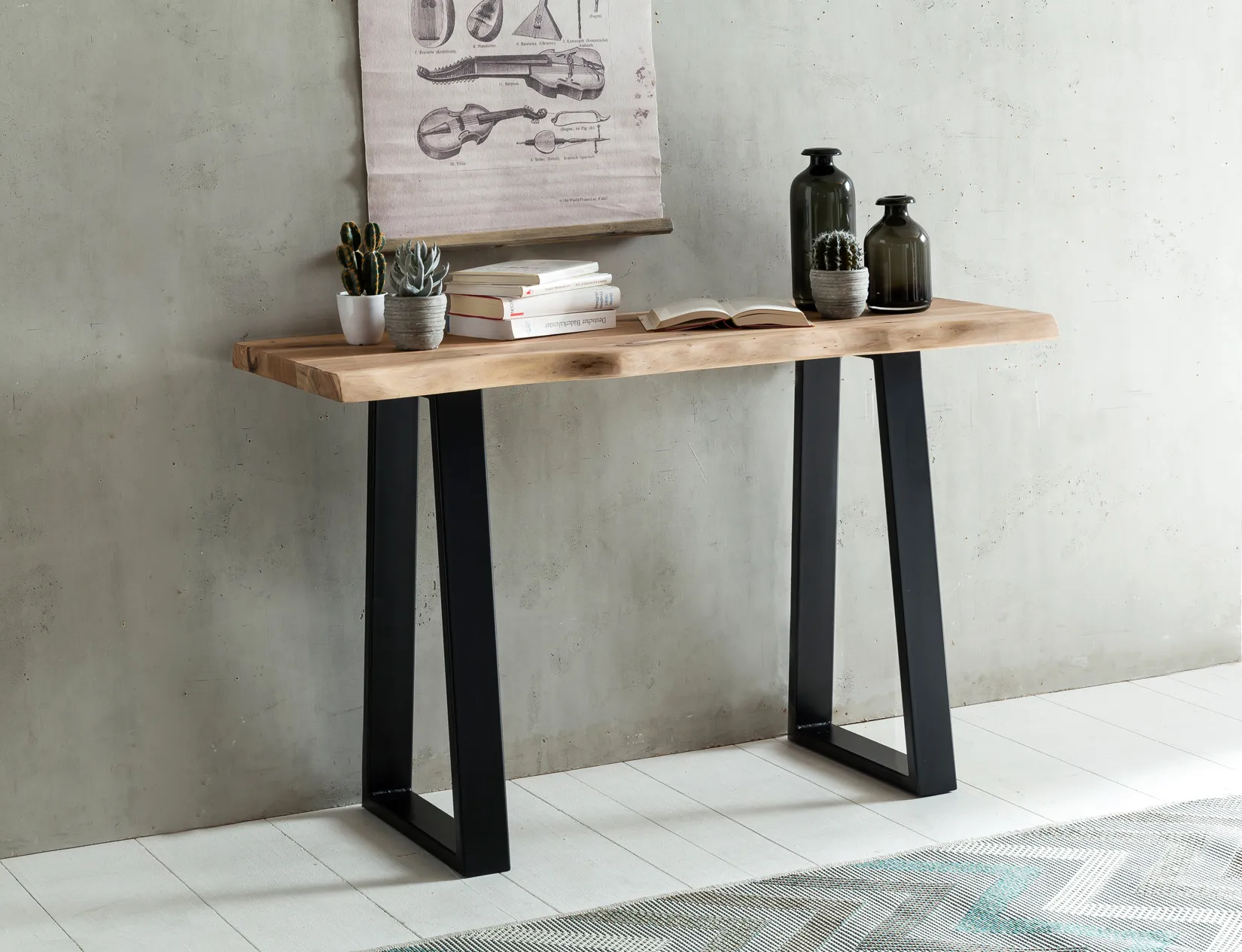 Design und Verwendung: Die natürlichen Unebenheiten und die Wuchtigkeit machen die Konsole einzigartig. Durch die kompakte Größe von 120 cm findet man auch in kleineren Räumen den perfekten Platz für den Tisch - Sowohl als Konsolentisch, als auch als Schreibtisch verwendbar - der Bürostuhl lässt sich unter den Tisch schieben.