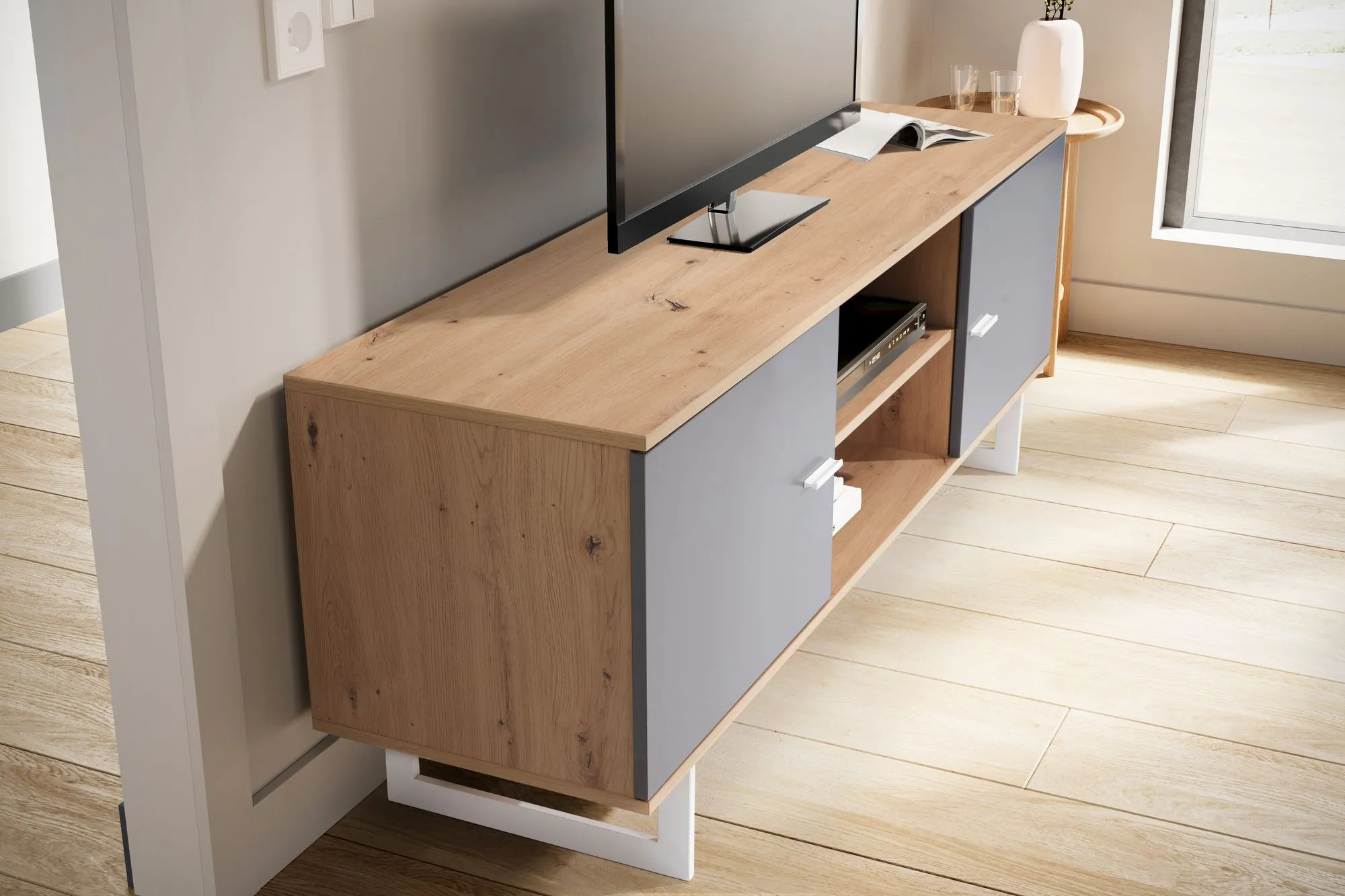 - Lowboard: folierte Spanplatte in Grau bzw. Eichen-Optik