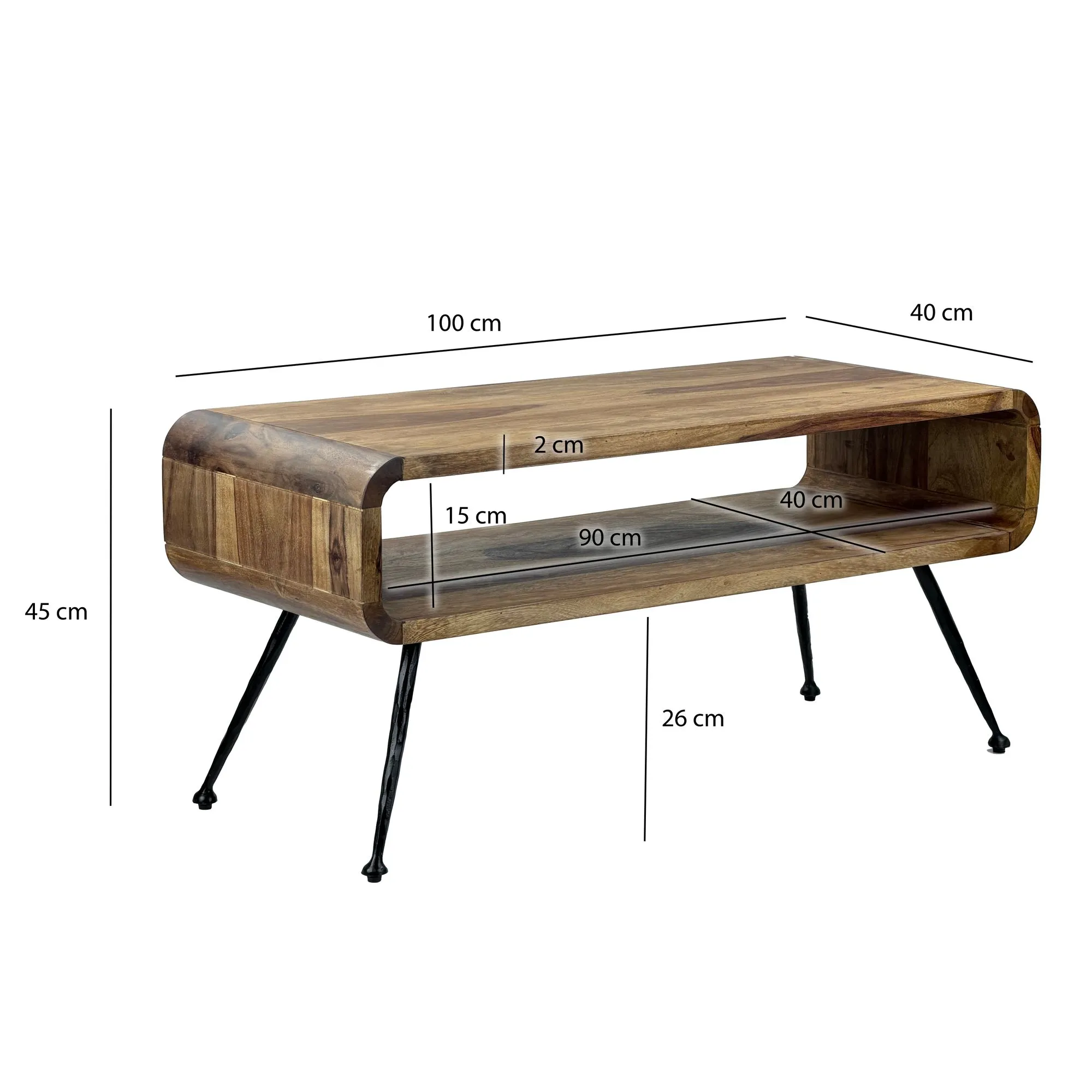 Wohnling Retro Couchtisch Sheesham Massivholz 100cm · Wohnzimmertisch rechteckig mit Ablagefach · Handgefertigter Sofatisch aus Holz mit Metallbeinen im Industrial Design