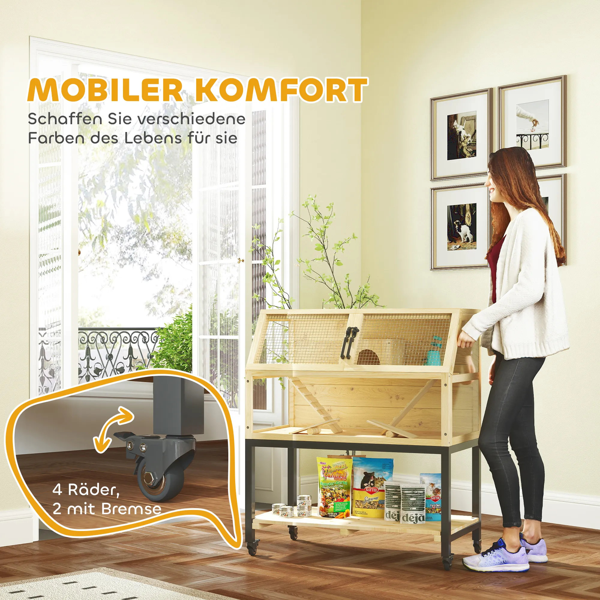 Zwerghamsterkäfig aus Holz mit Ablagefach, Rädern, Rampen, Wasserflasche, Hütte, Wippen, 87 x 43 x 101cm