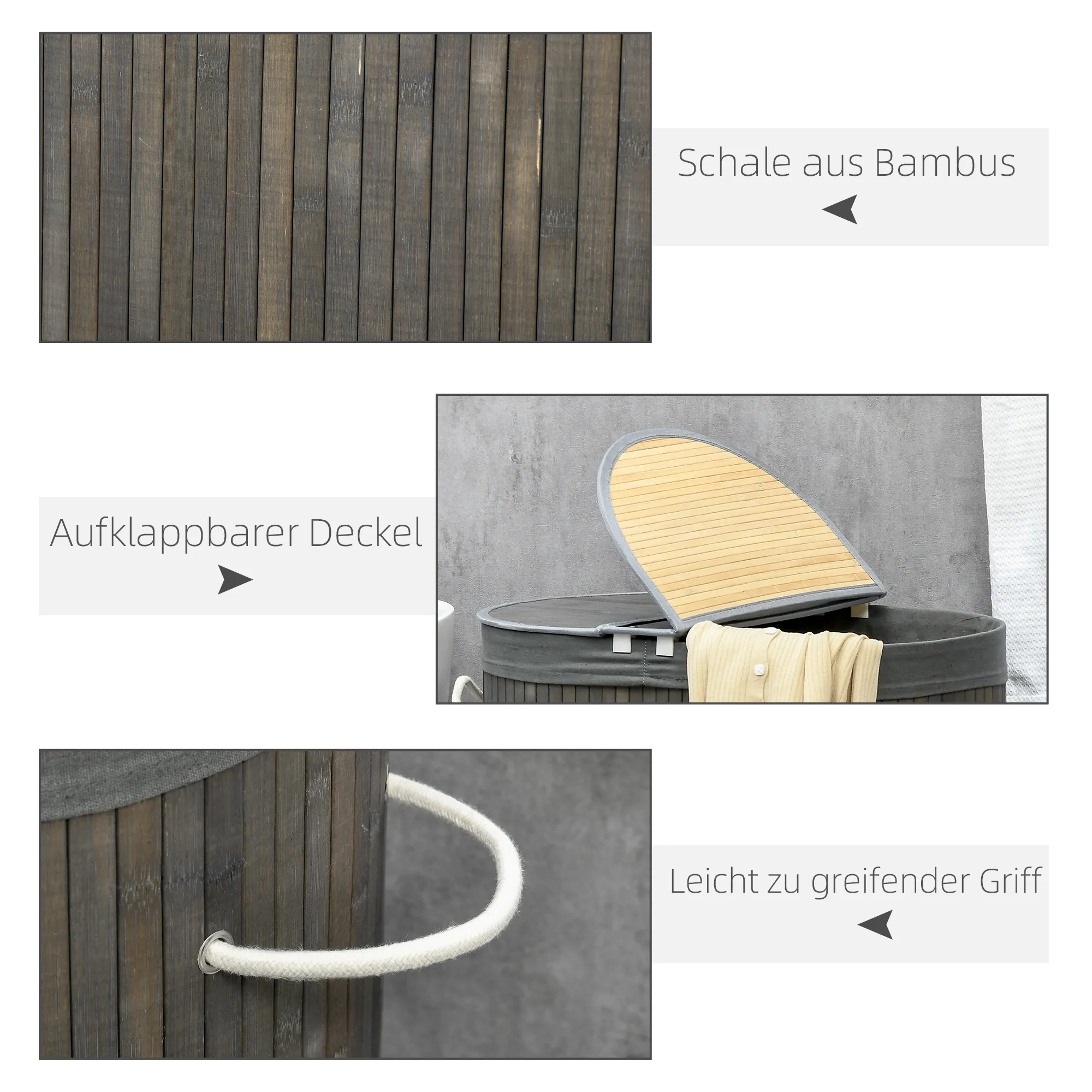 100 L Wäschekorb mit Deckel, Griff, 2 Abschnitte, herausnehmbarer Wäschesack, für Schlafzimmer, Badezimmer, Bambus, Grau