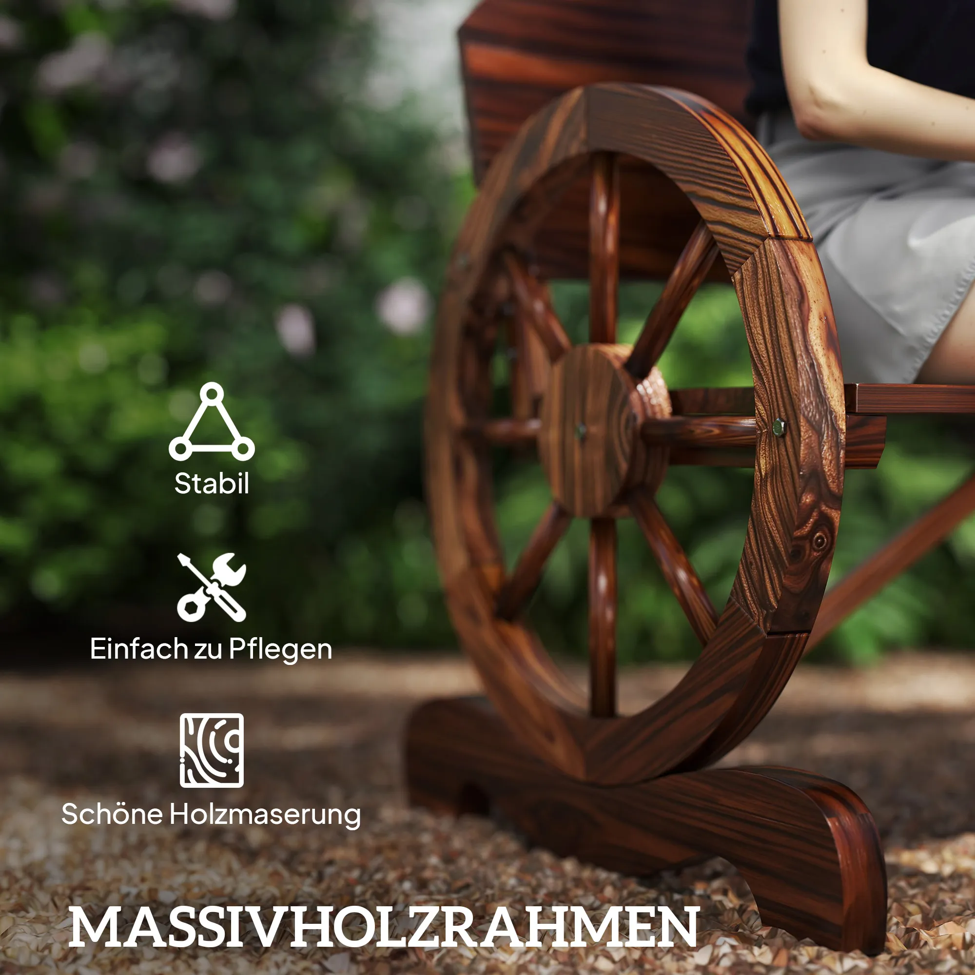 Beschreibung:- Einzigartiges rustikales Design vereint traditionelle Garten-Holzbank mit Armlehnen in Rädernform