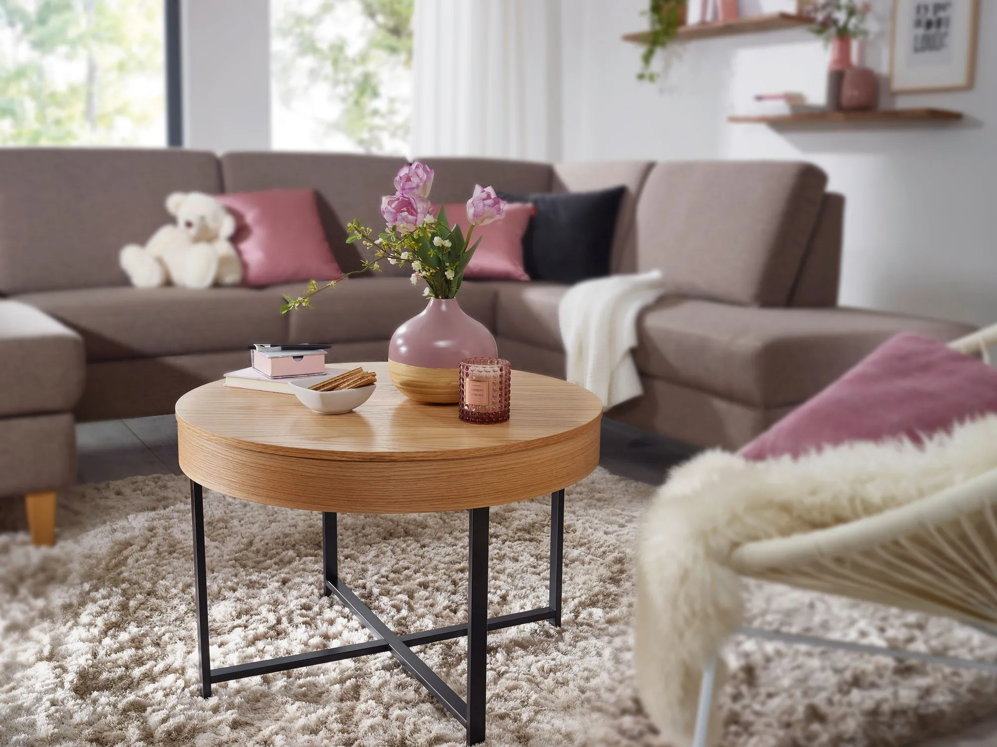 Wohnling Design Couchtisch Rund Ø 69 cm mit Eichen Optik Tisch mit Stauraum