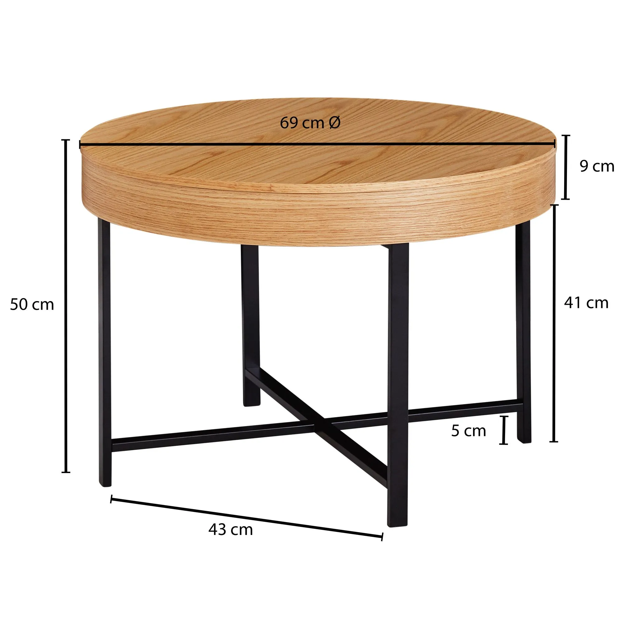 WOHNLING Design Couchtisch WL5.978 Rund Ø 69 cm mit Eichen Optik Tisch mit Stauraum | Lounge-Wohnzimmertisch mit Metallbeine | MDF Beistelltisch