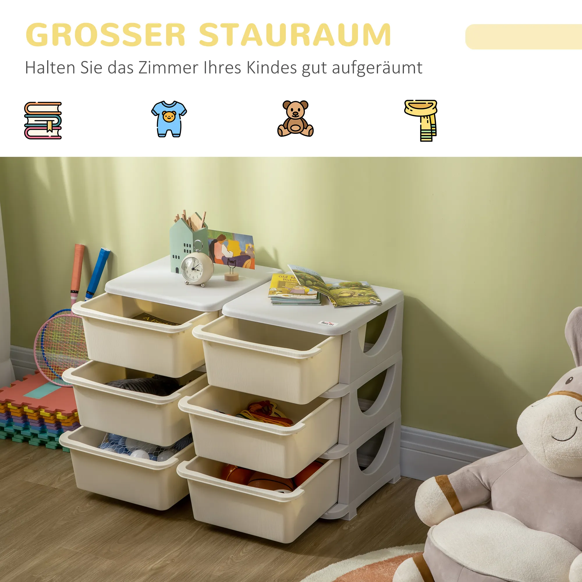 Mit den hübschen Aufbewahrungsboxen von wird das Ordnunghalten zum Vergnügen! Das kindgerechte Design mit abgerundeten Kanten sorgt für Sicherheit und Spaß zugleich. Sechs geräumige Schubladen bieten viel Platz für Spielzeug, Kleidung, Kissen und andere Dinge. So wird das Aufräumen zum Kinderspiel. Bringen Sie Freude und Ordnung ins Kinderzimmer – mit den praktischen Aufbewahrungsboxen von !