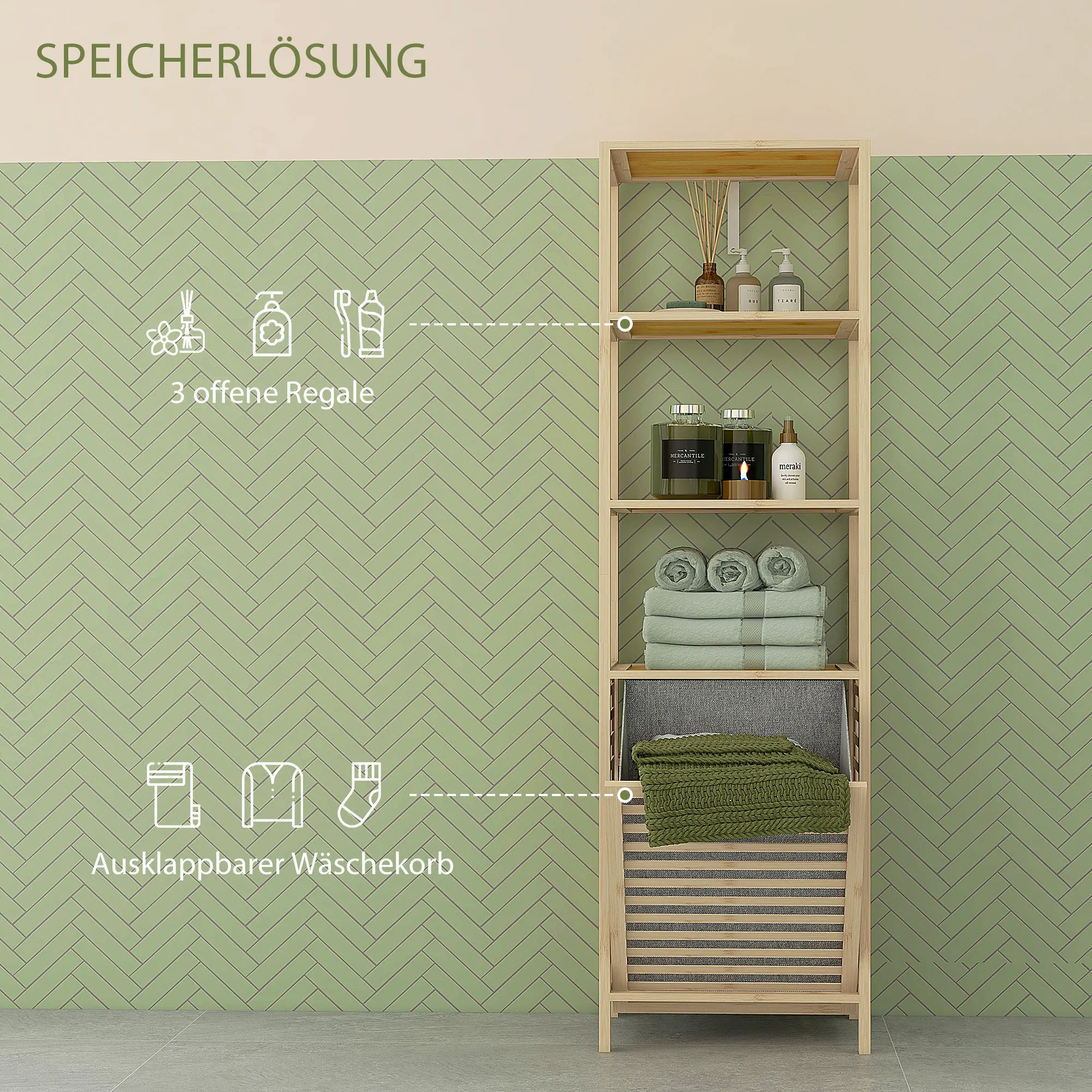 Entdecken Sie den eleganten Badschrank für Ihr Badezimmer, eine perfekte Kombination aus Stil und Funktionalität. Dieses schlanke Badregal bietet mit drei Einlegeböden reichlich Platz für Ihre Badutensilien. Ein innovativer Kippschrank mit Stoffsack für die Wäsche sorgt für Ordnung und Übersichtlichkeit. Aus natürlichem Bambus gefertigt, besticht er durch ein schmales, hohes Design mit eleganten Lamellentüren und einem erhöhten Sockel, abgerundet durch eine glatte Lackierung.