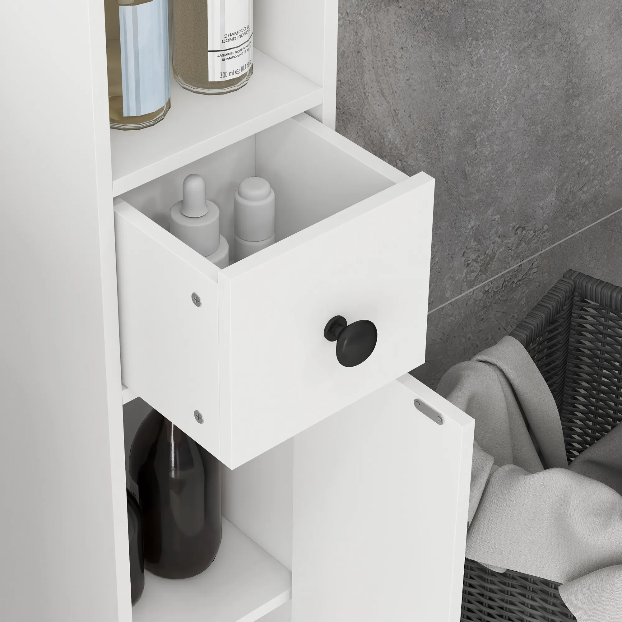 Badezimmerschrank, 4 Regale, Schublade, Spanplatte, schlankes Design, Weiß