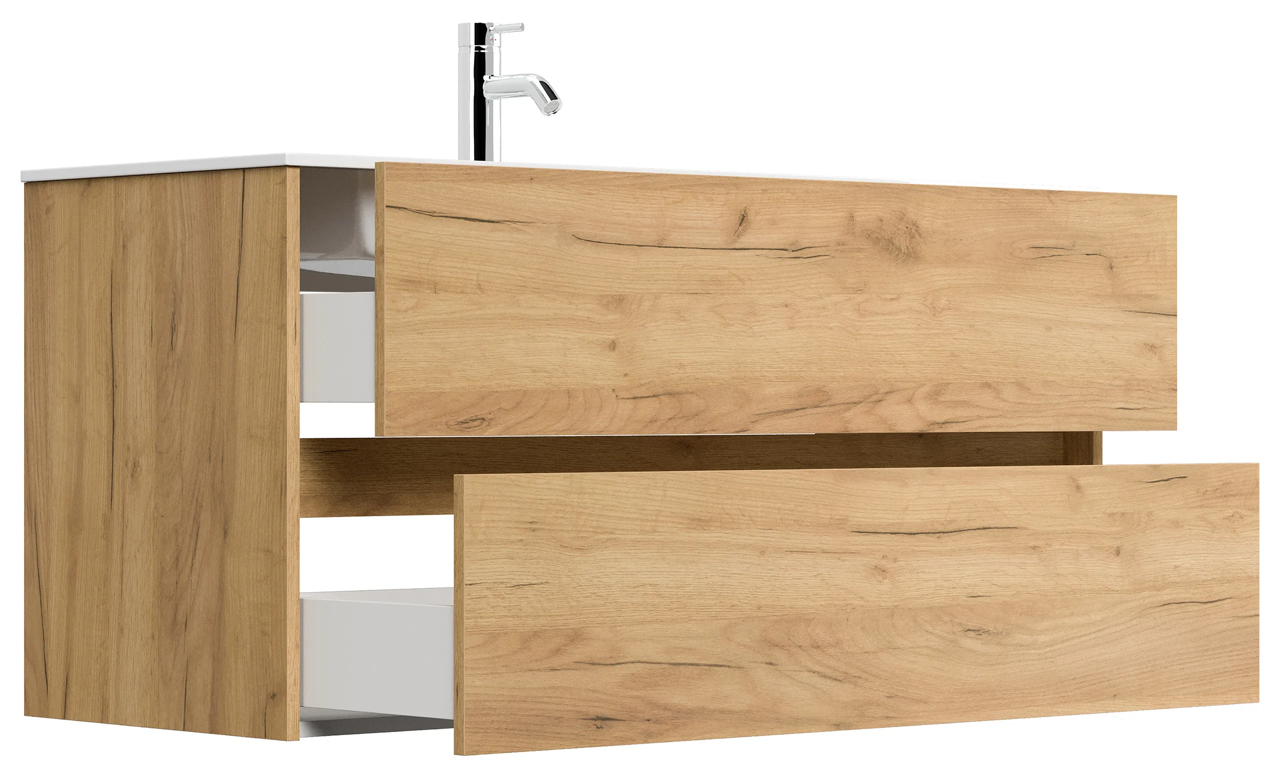 Das Badmöbel wurde designed in Deutschland und aus hochwertigem Holzwerkstoff gefertigt. Schubläden und/oder Türen sind mit einem Softclose System ausgestattet. Eiche Gold - Täuschend echte Holzoptik.
